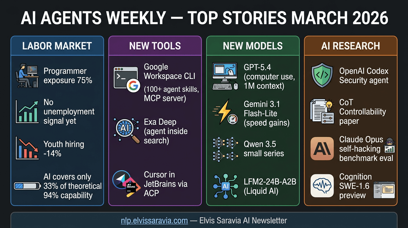 rzem.guru🤖 AI Agents Weekly: AI Labor Market Impacts, Google Workspace CLI, GPT-5.4, Exa Deep, and More🤖 AI Agents Weekly: AI Labor Market Impacts, Google Workspace CLI, GPT-5.4, Exa Deep, and More Original article: https://nlp.elvissaravia.com/p/ai-agents-weekly-ai-labor-market Author: Elvis Saravia | Published: March 8, 2026 Source: Elvis Saravia A...4h ago·4 min read