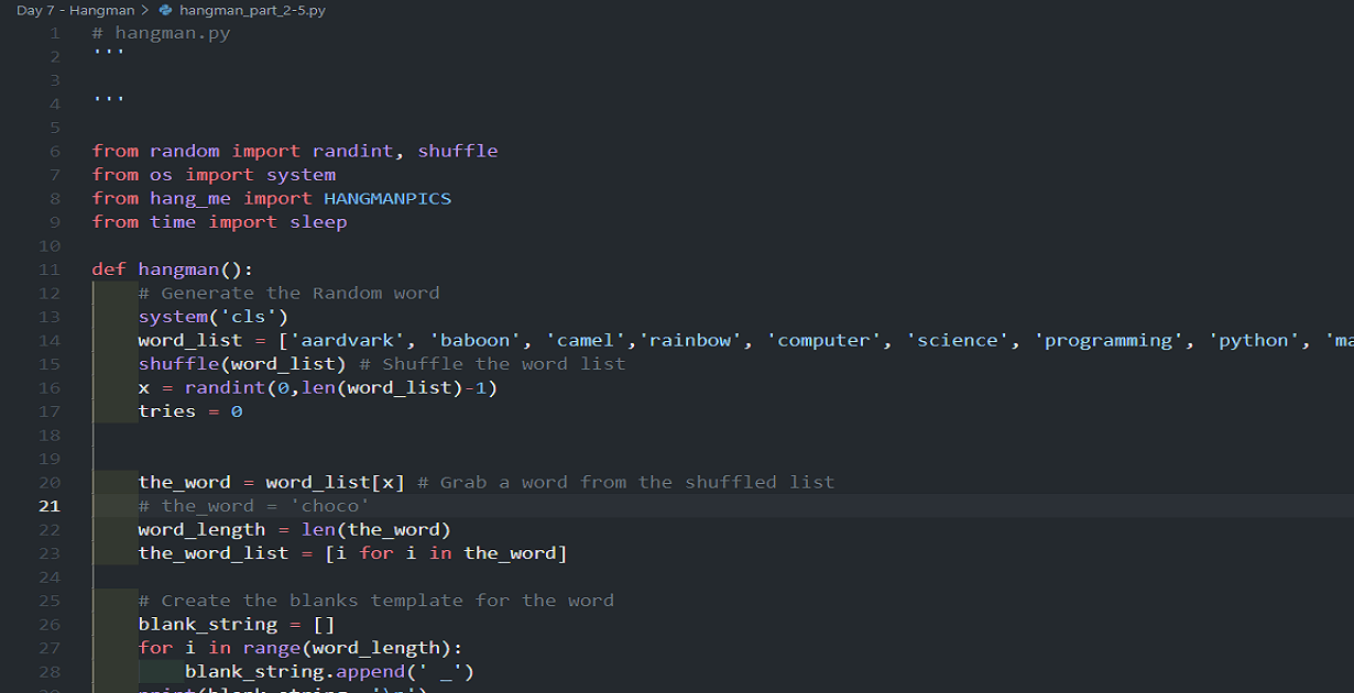 Today's, cough, task was to create the hangman game.The lessons build the game slowly. It starts with designing a flowchart (See the README.md on my GitHub repo,) and after I wrote that and switched up a gear when I hit a marker on the flow chart for...