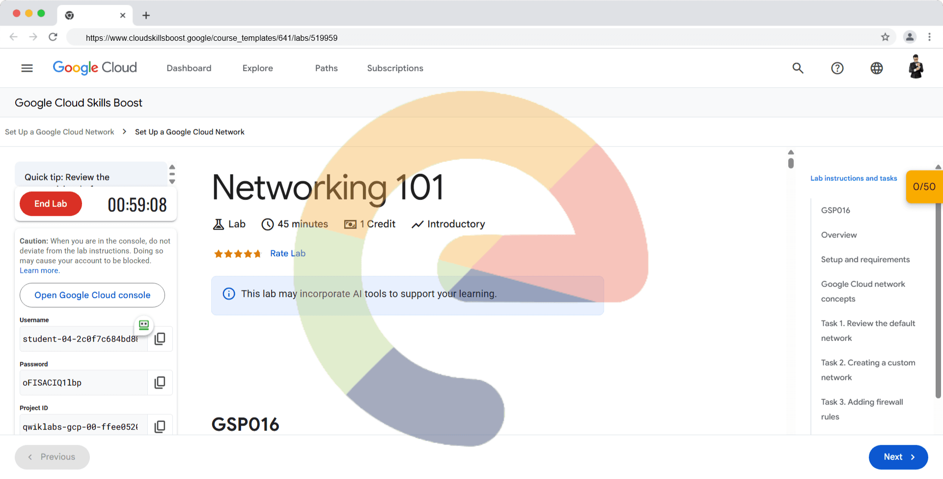 Overview In this lab you will learn how to perform basic networking tasks on Google Cloud (including Compute Engine instances) and how Google Cloud might differ from an on-premises setup. You'll develop a network and 3 subnetworks, resulting in this ...
