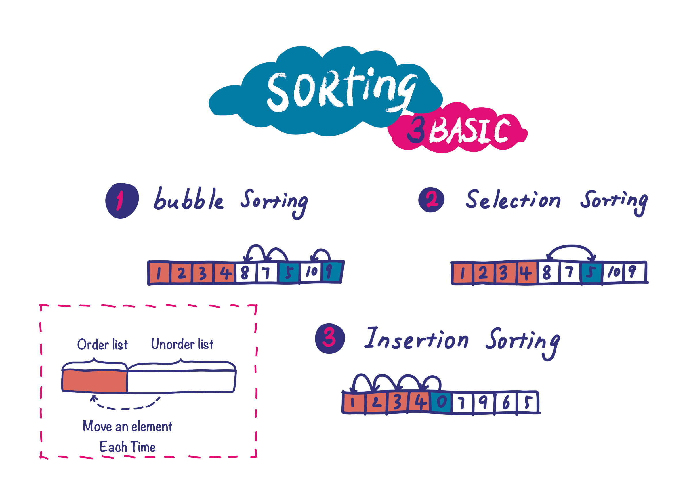 Bubble sorting, selection sorting and insertion sorting are the three most basic sorting algorithms. They seem very different at first look, but essentially they share the same principle underneath. The process could be split into two steps: Partiti...
