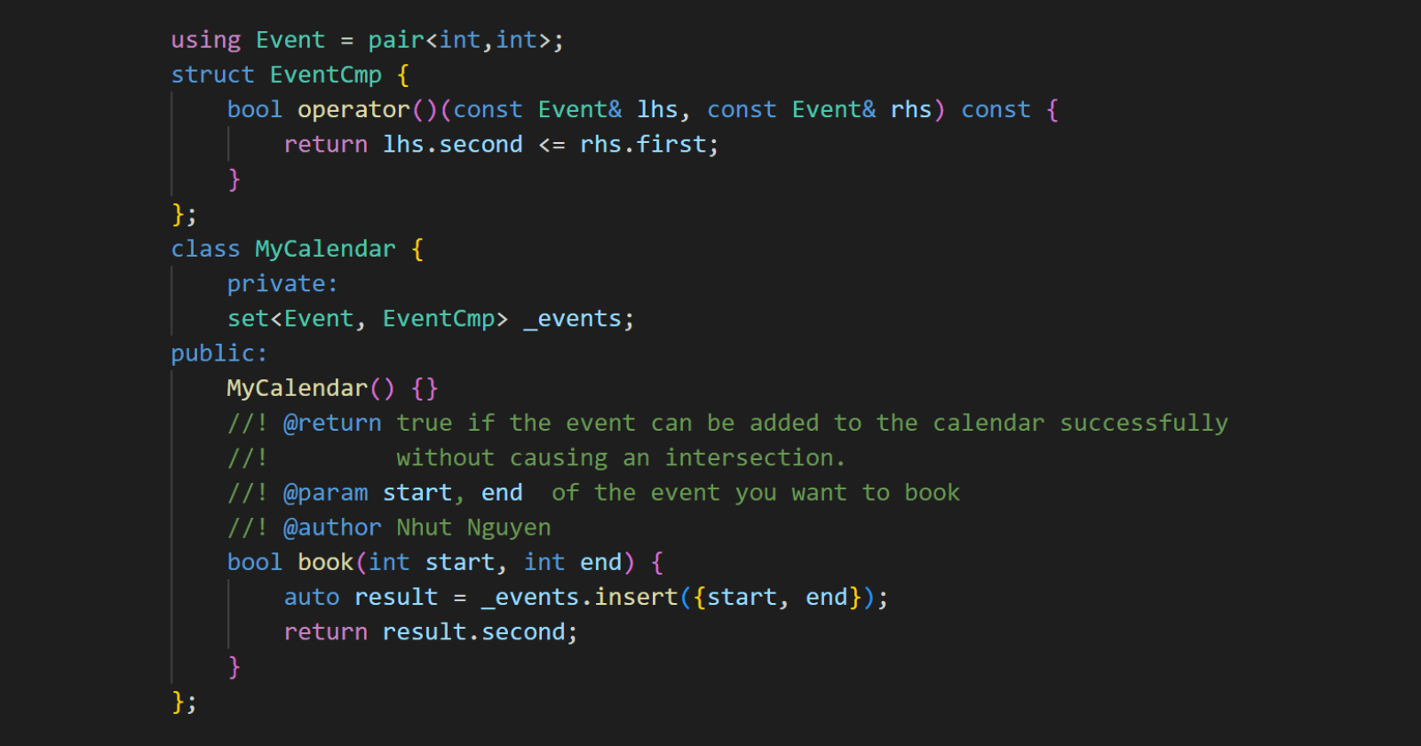 Problem statement You are implementing a program to use as your calendar. We can add a new event if adding the event will not cause a double booking. A double booking happens when two events have some non-empty intersection (i.e., some moment is comm...