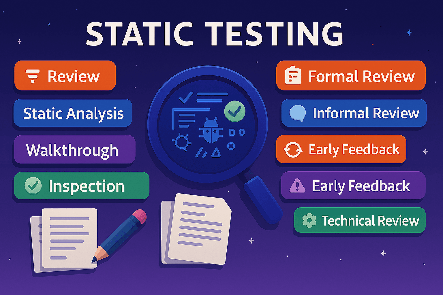 Static Testing Basics In contrast to dynamic testing, in static testing the software under test does not need to be executed. Code, process specification, system architecture specification or other work products are evaluated through manual examinati...