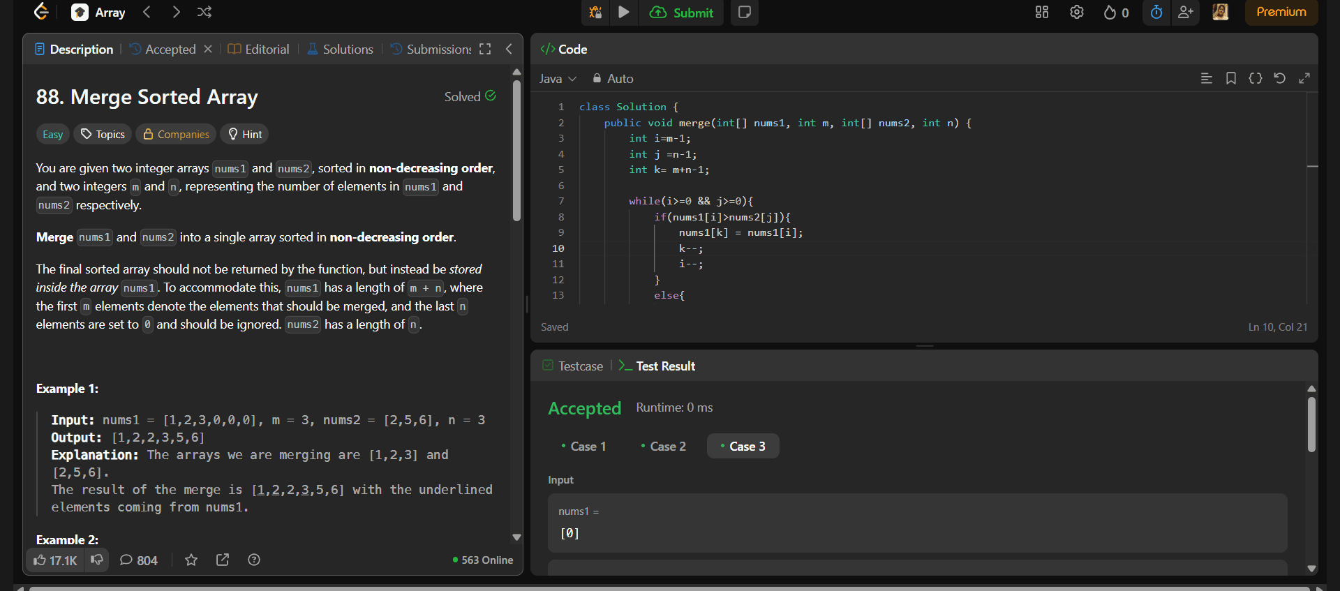 LeetCode Link Problem statement: You are given two integer arrays nums1 and nums2, sorted in non-decreasing order, and two integers m and n, representing the number of elements in nums1 and nums2 respectively. Merge nums1 and nums2 into a single arra...