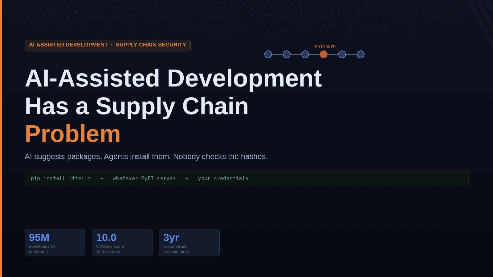 Supply chain attacks nearly doubled between 2025 and Q1 2026. AI-assisted development hit mainstream in the same window. That's not a coincidence. AI tools suggest packages. Agents install them mid-ta