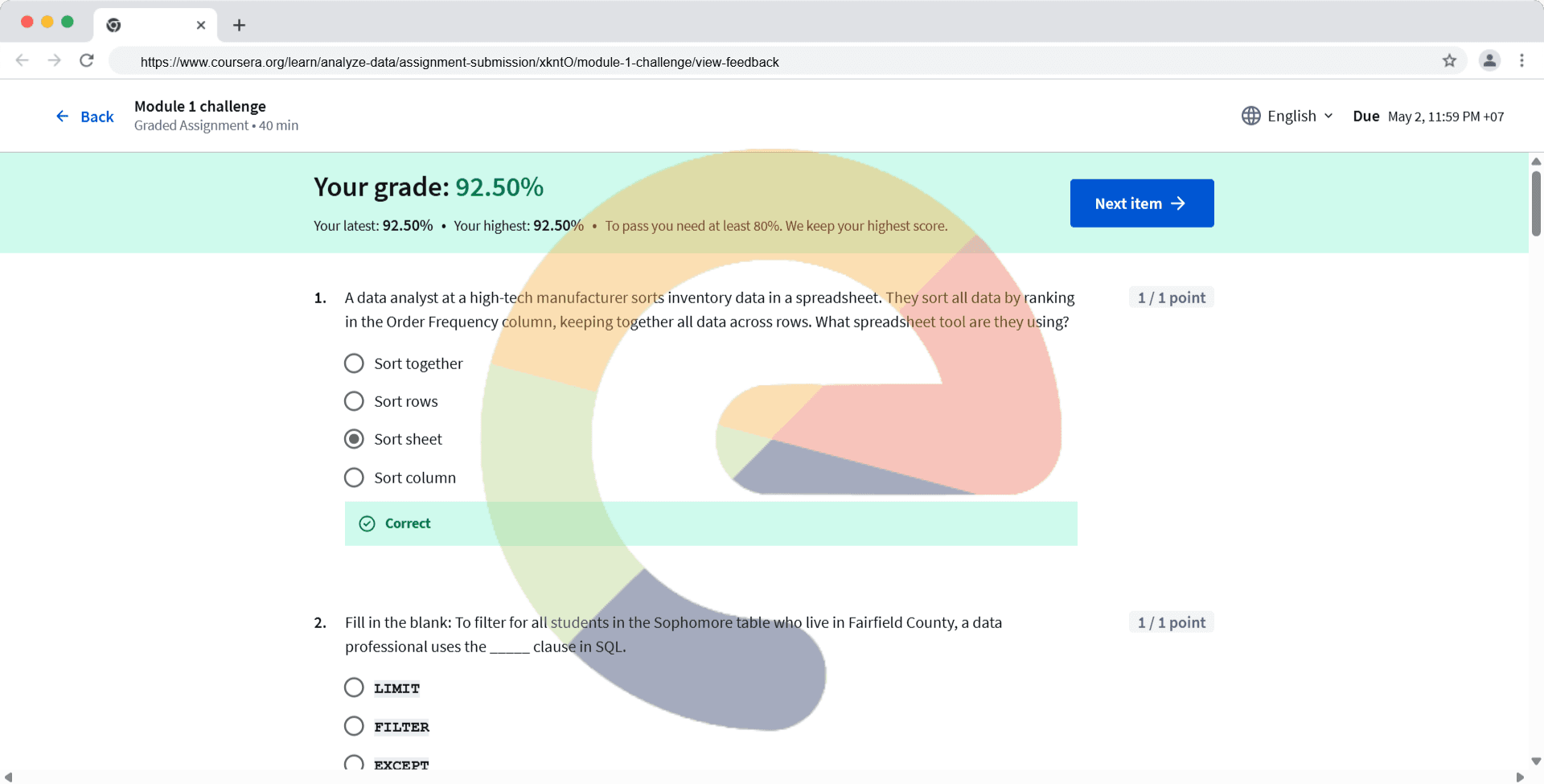 A data analyst at a high-tech manufacturer sorts inventory data in a spreadsheet. They sort all data by ranking in the Order Frequency column, keeping together all data across rows. What spreadsheet tool are they using? Sort together Sort rows Sor...