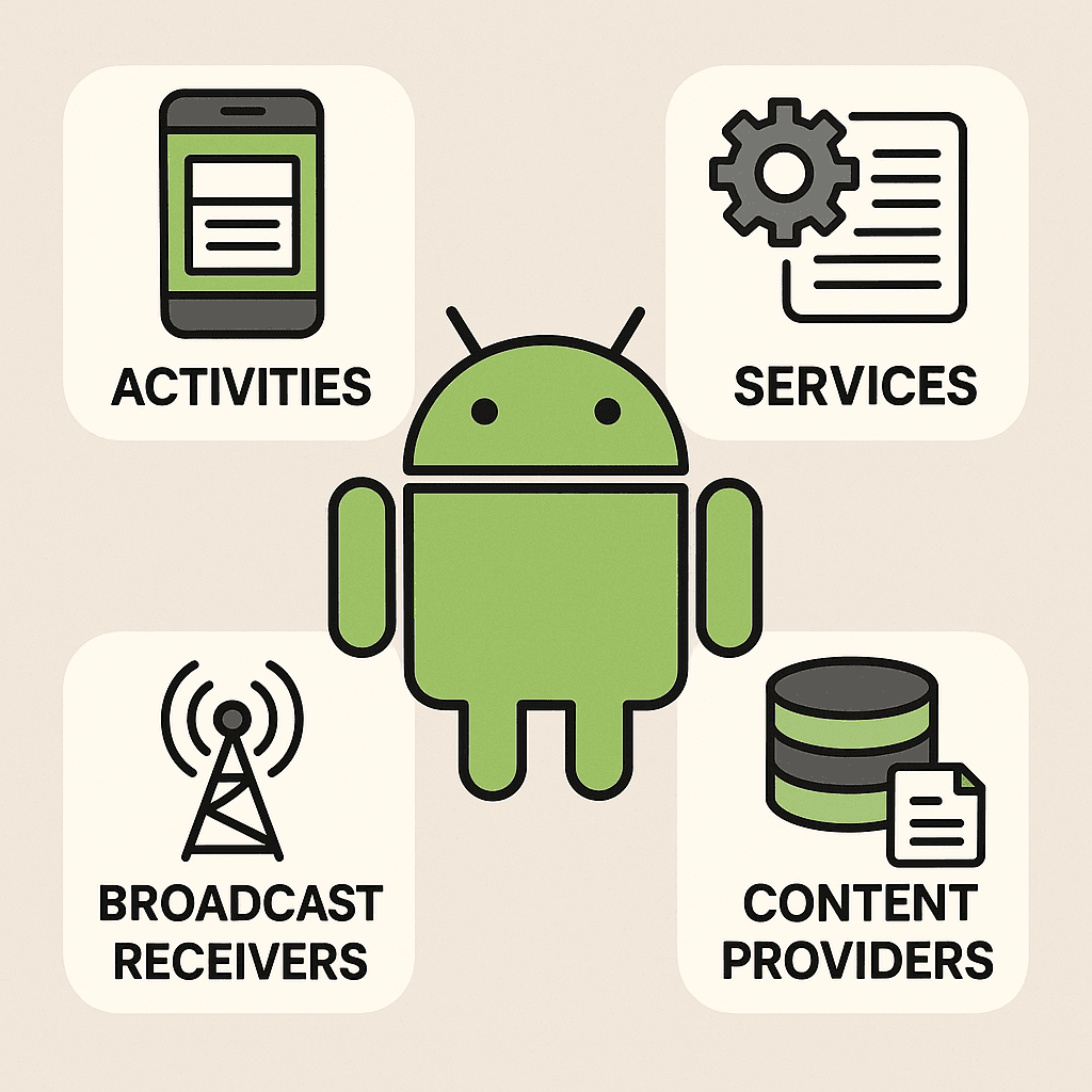 本文撰寫時間為 2025 年 7 月,請注意該文章的介紹是否與閱讀時有落差。 Android 架構與元件角色 系統層次 Linux Kernel(Binder IPC、電源管理、驅動程式) Android Runtime(ART、JIT/AOT 編譯) Framework API(ActivityManager、PackageManager) Application 層(四大元件 + Jetpack 架構元件) Intent 與 IPC 顯式 Intent(指定 Component...