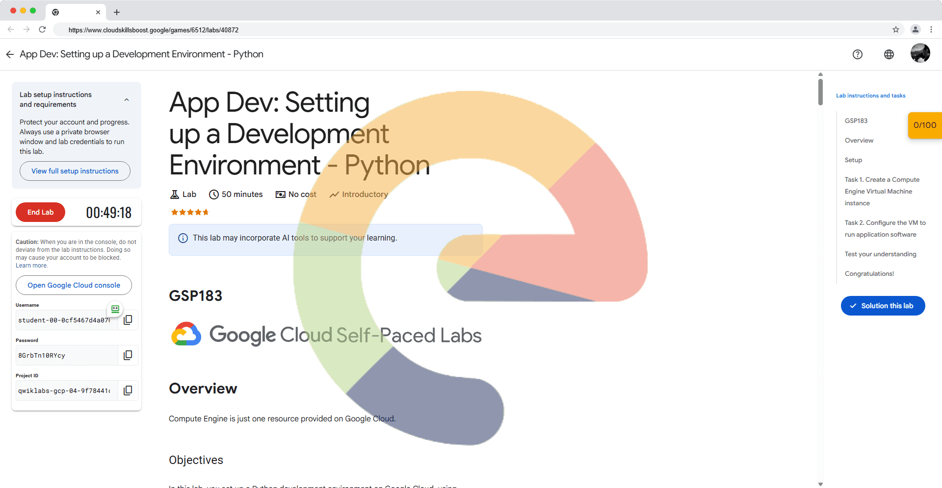 Overview Compute Engine is just one resource provided on Google Cloud. Objectives In this lab, you set up a Python development environment on Google Cloud, using Compute Engine to create a virtual machine (VM) and installing software libraries for so...