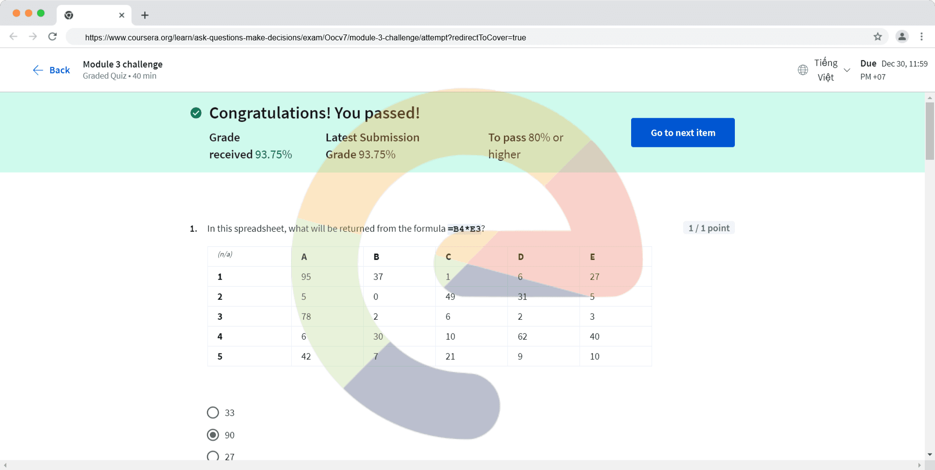 In this spreadsheet, what will be returned from the formula =B4*E3? (n/a)ABCDE1953716272504931537826234630106240542721910 33 90 27 10 Fill in the blank: A range is a _____ of two or more cells. collection worksheet table grid What are...
