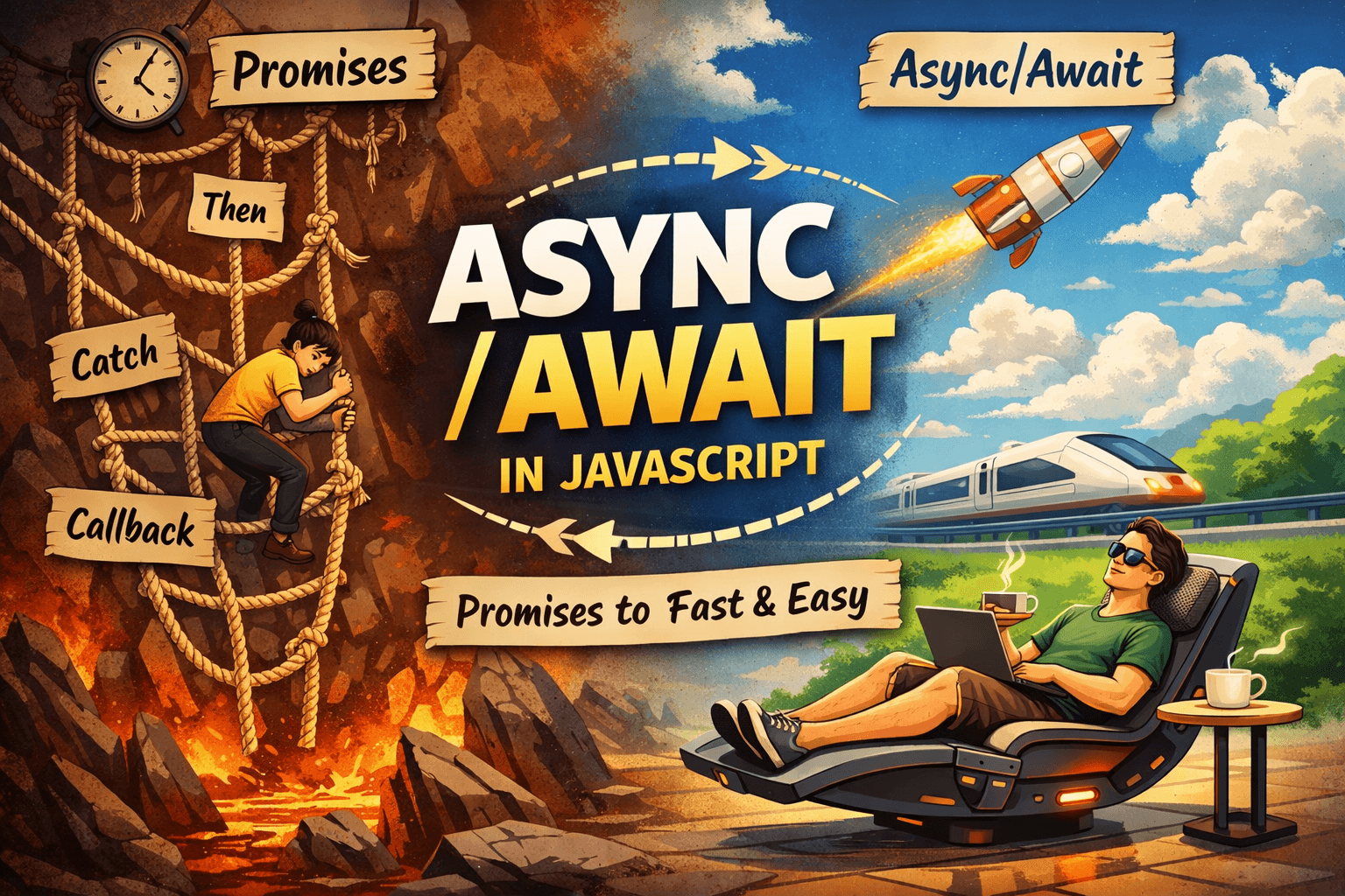 to understand why async nature was introduced you must know about callbacks and promises . after reading these you will know about callback hell and how promises solve it . now there is problem with p