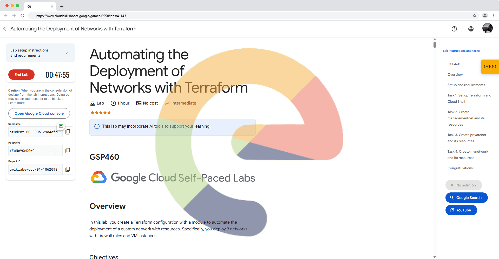 Overview In this lab, you create a Terraform configuration with a module to automate the deployment of a custom network with resources. Specifically, you deploy 3 networks with firewall rules and VM instances. Objectives Create a configuration for a...