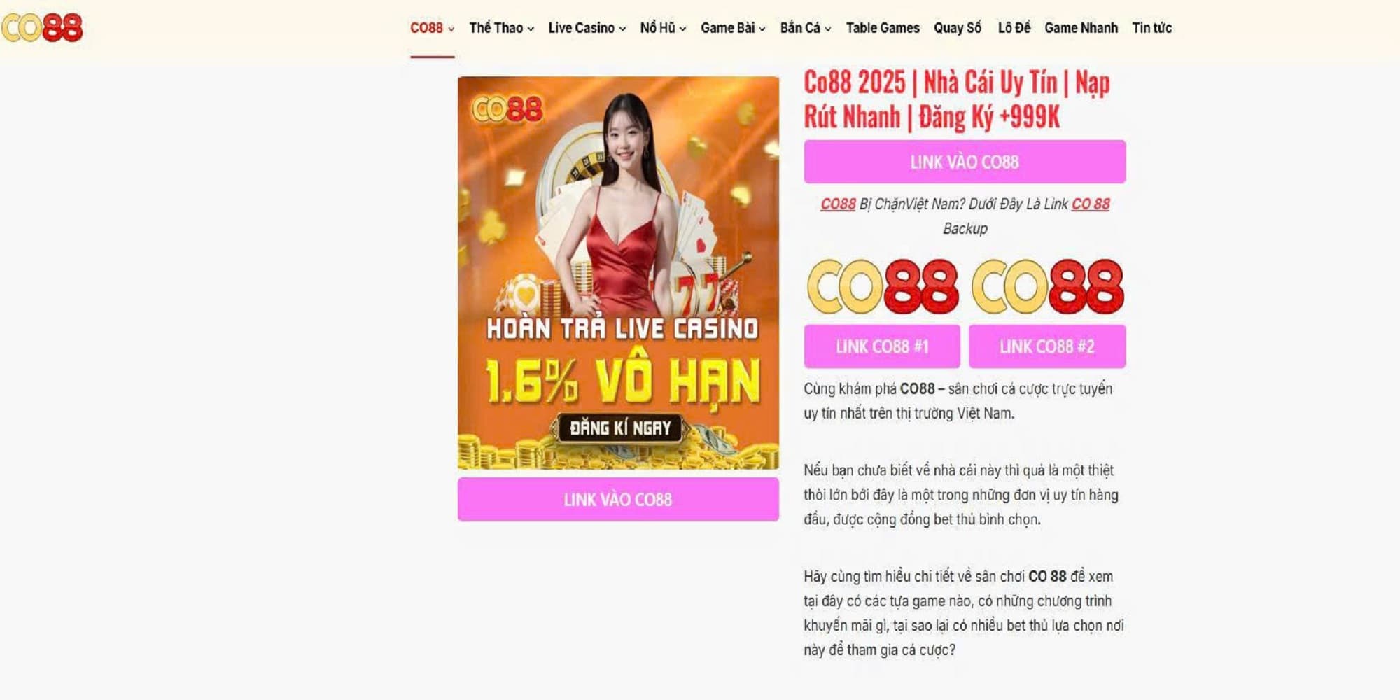 CO88 mang đến hàng loạt trò chơi hấp dẫn với tỷ lệ trả thưởng cao. Dù bạn yêu thích cá cược thể thao, game bài hay quay hũ, CO88 đều đáp ứng với dịch vụ chuyên nghiệp. Giao dịch siêu tốc, bảo mật tuyệt đối và nhiều chương trình ưu đãi khủng. Đừng bỏ ...