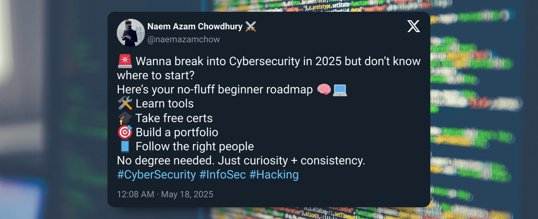 🔐 Thinking about starting a career in cybersecurity this year? Here’s your no-fluff roadmap to get started in 2025, even if you know NOTHING about hacking, tools, or coding. I’ve helped dozens of beginners go from “What is Nmap?” to landing internsh...