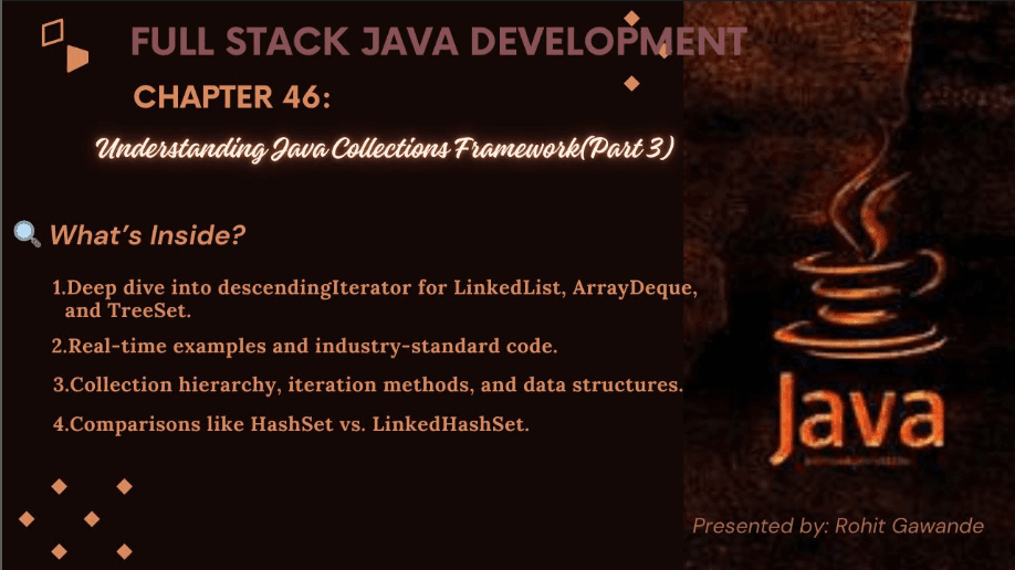 2.2 DescendingIterator Introduction The descendingIterator() method allows traversal of elements in reverse order. It is available in: LinkedList ArrayDeque TreeSet How DescendingIterator Works The iterator starts from the last element and move...