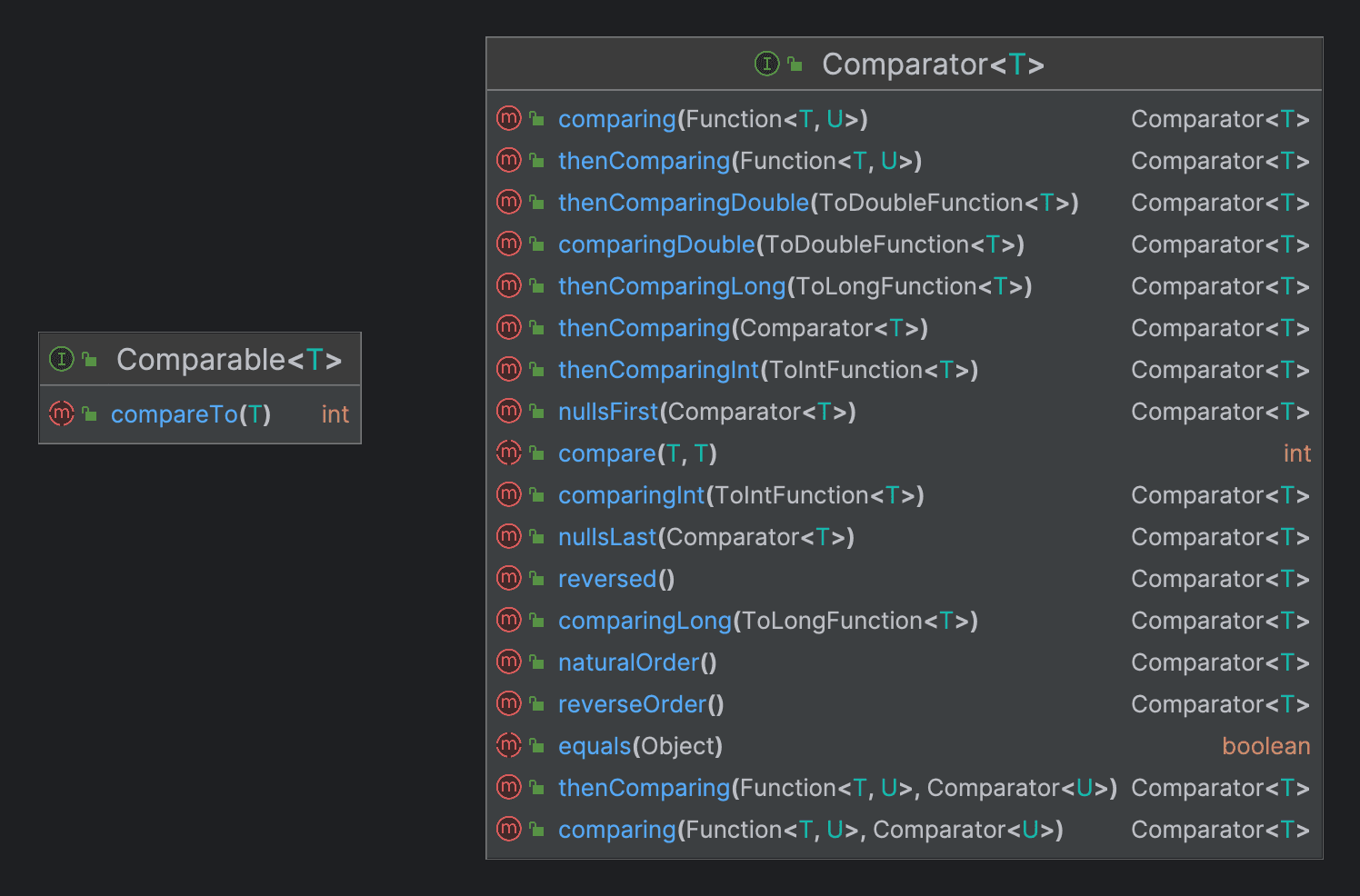 지인이 최근 면접에서 받은 질문이 재밌어보여 정리해보았습니다. 개요 둘다 Collections Framework의 Infrastructure 영역의 Ordering과 관련된 인터페이스입니다. 참고 자료: Outline of the Collections Framework 둘다 정렬을 위해 사용하지만 서로 어떤 차이가 있는지 알아보겠습니다. ComparableComparator 인퍼테이스이다.인터페이스이다. compareTo() 메...
