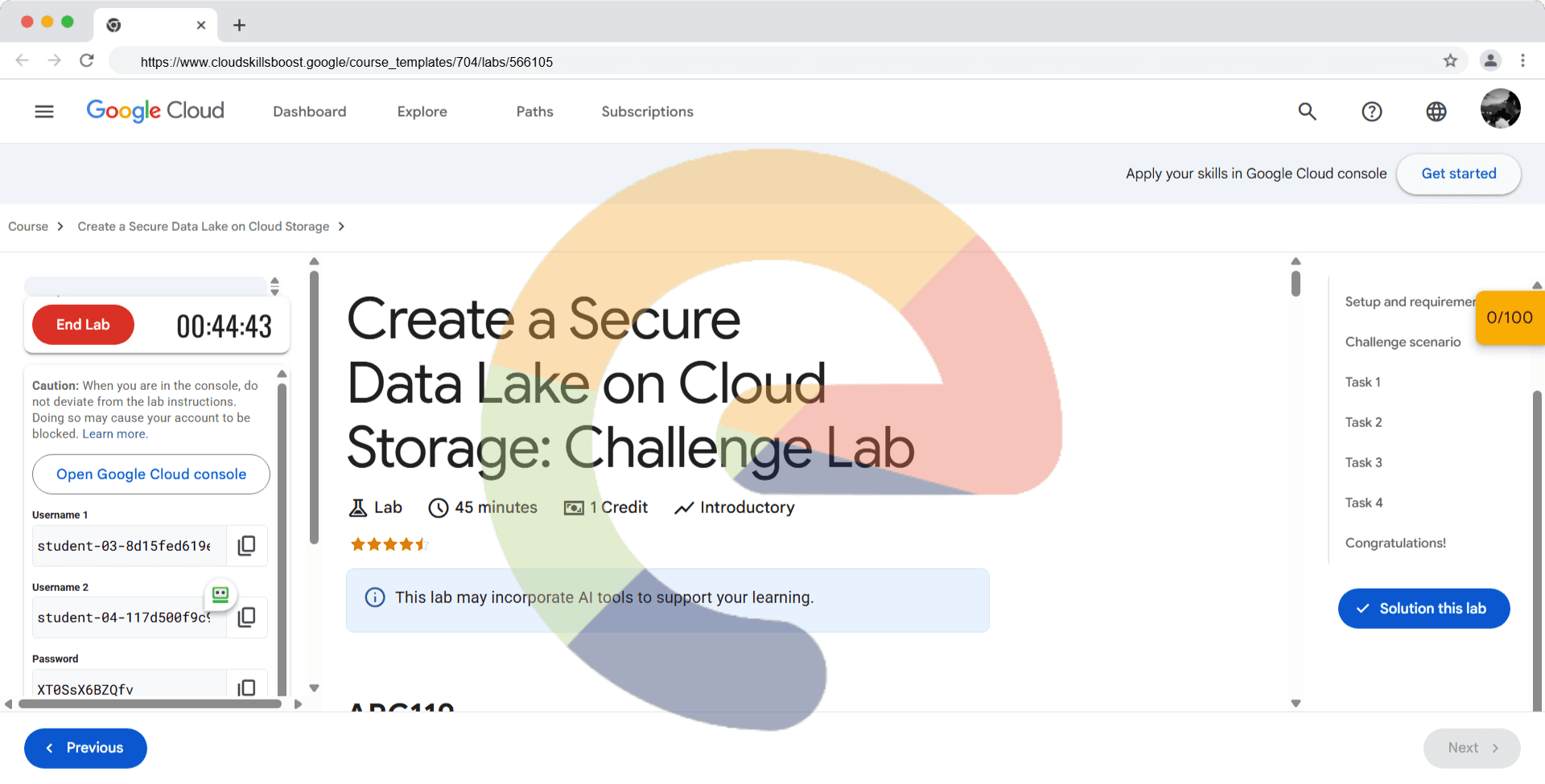 Overview In this challenge lab, you’re given a scenario and a set of tasks. Instead of following step-by-step instructions, you use the skills learned from the lab in the quest to figure out how to complete the tasks on your own! An automated scoring...