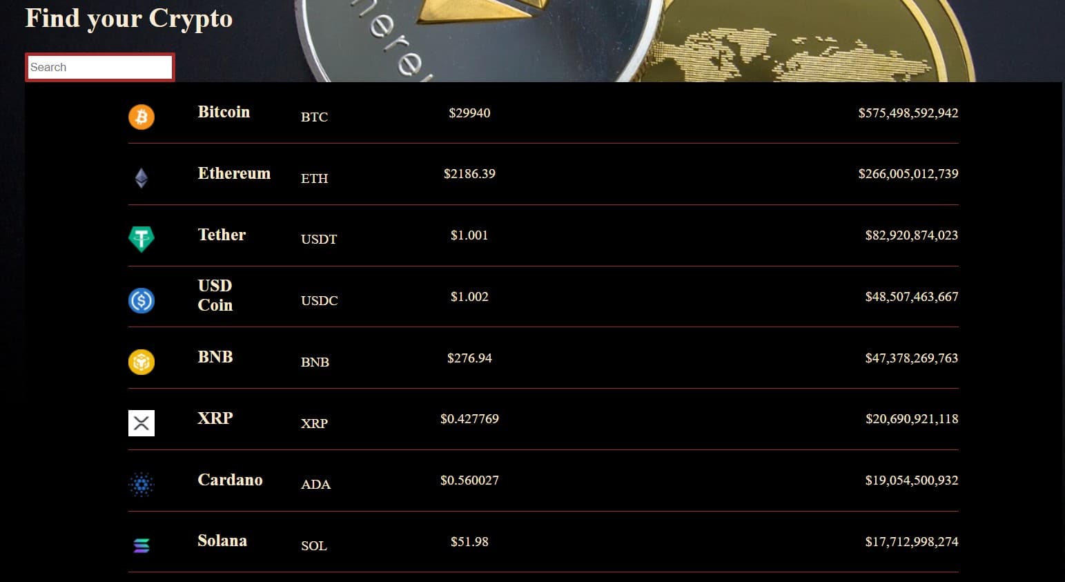 Create a Dashboard for crypto coins and fetch Live data using API. Feel free to comment your views on it