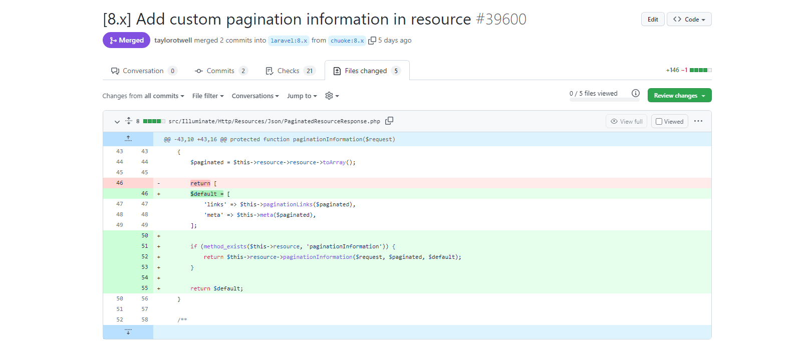 Recently submitted an idea to Laravel framework - add a custom paging information in PaginatedResourceResponse detection method, in order to use the Resource class output information, able to custom paging information is very convenient.