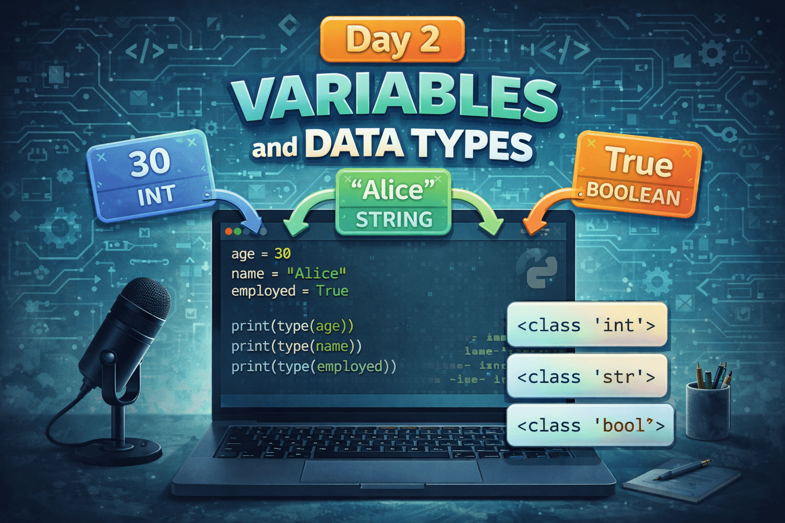 Today I learned about: Variables. Data Types. Types Of Operator. Type Function and Type Casting. I/P Function. Variables Variables are used to store data in Python. Instead of writing values again and again, we can assign them to a variable na...