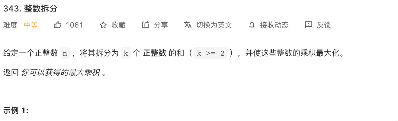343. 整数拆分 function integerBreak(n: number): number { let dp = new Array(n + 1).fill(0); dp[2] = 1; for(let i = 3; i <= n; i++) { for(let j = 1; j <= i / 2; j++) { dp[i] = Math.max(dp[i], dp[i - j] * j, (i - j) * j); ...