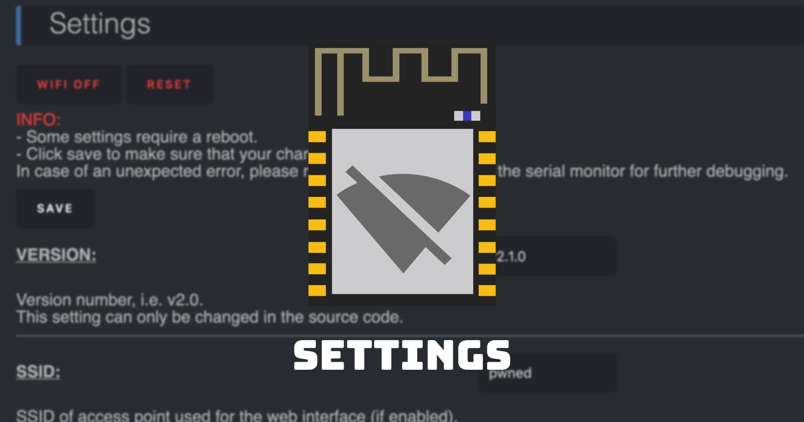 A reference of all ESP8266 Deauther settings as well as a tutorial on how to change them. Changing a setting using the Web Interface Connect to the WiFi network pwnedwith password deauther Open 192.168.4.1 in a browser Navigate to Settings (navbar ...