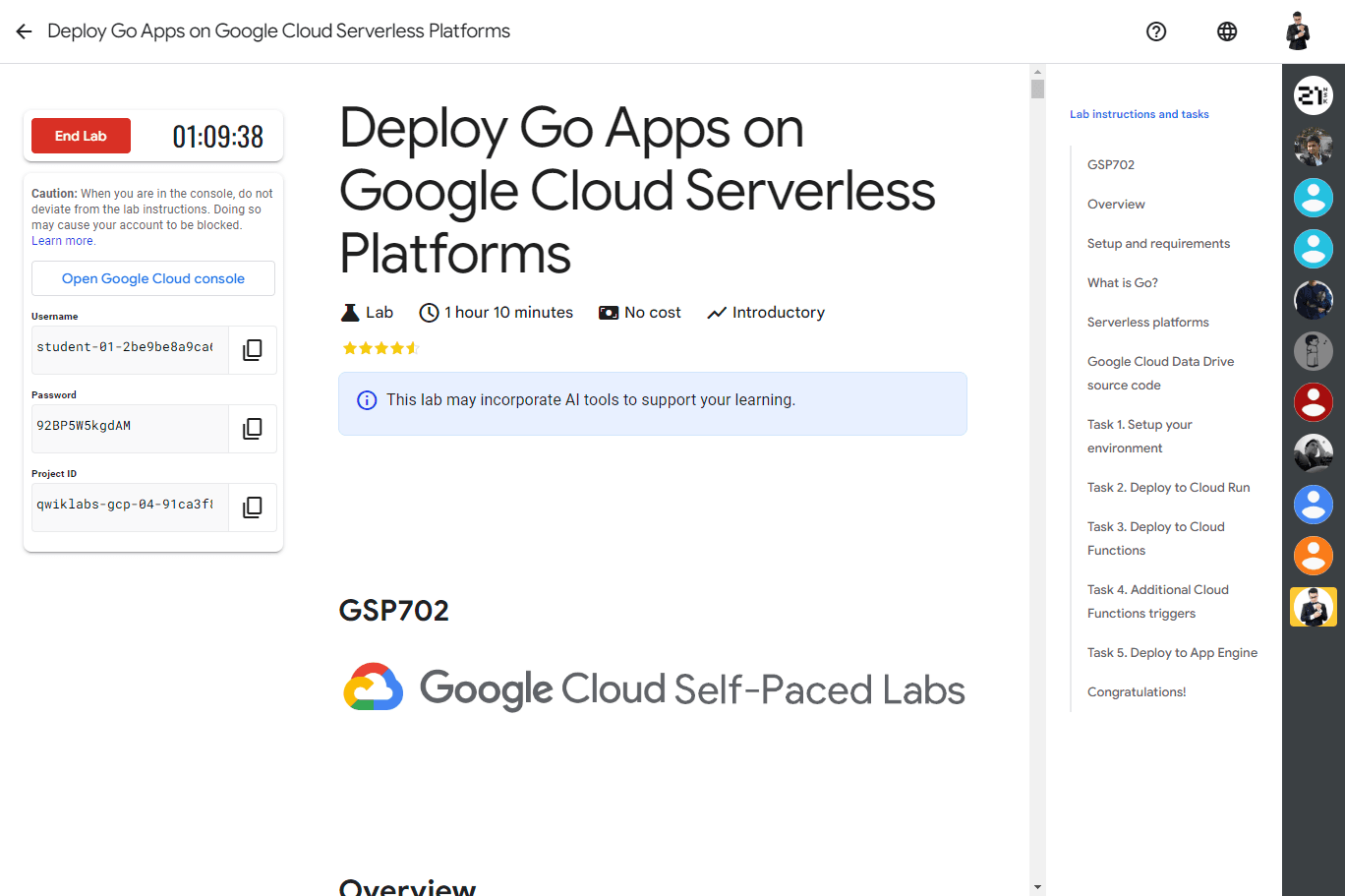 Overview Go is an open source programming language by Google that makes it easy to build fast, reliable, and efficient software at scale. In this lab you explore the basics of Go by deploying a simple Go app to Cloud Run, Cloud Functions, and App Eng...