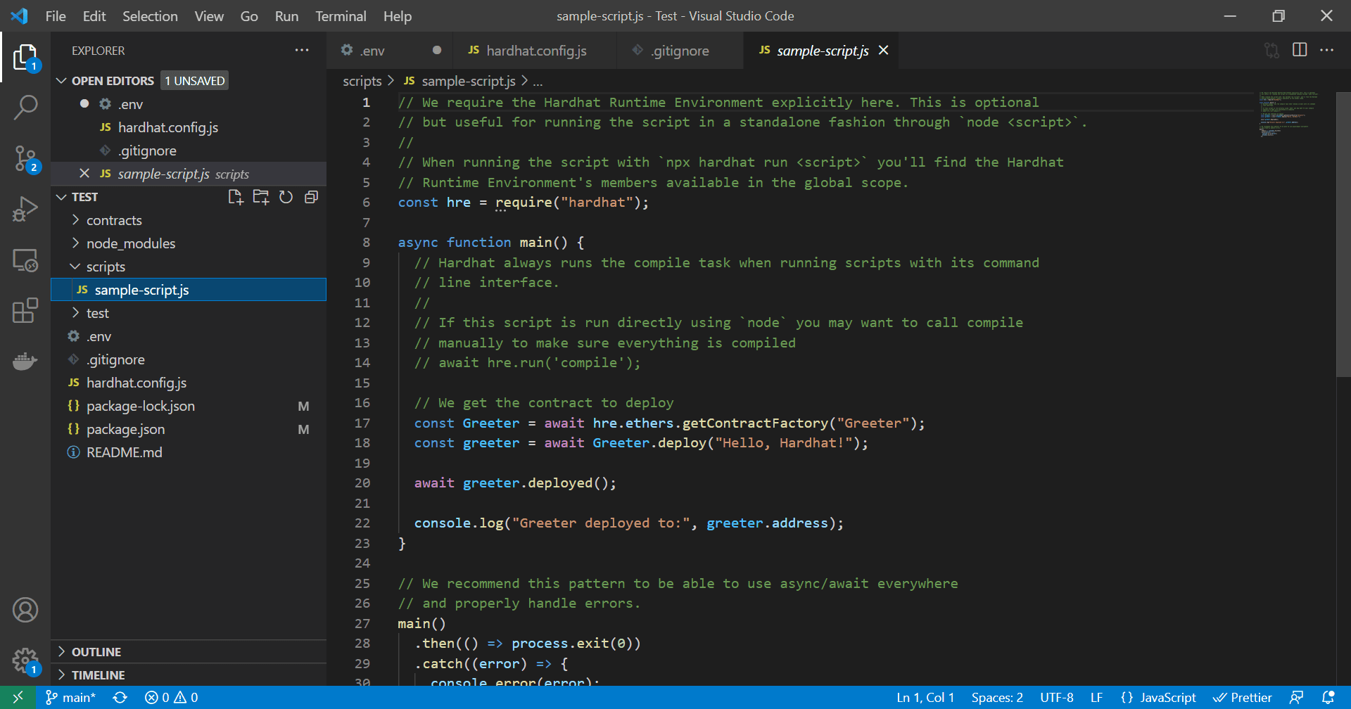 Hardhat already comes with a sample deploy script called "sample-script.js" if you choose the Create a Basic Project Option when starting your Hardhat project. Its pretty simple. Basically it gets a Contract Factory, which is a lot like what it sou...
