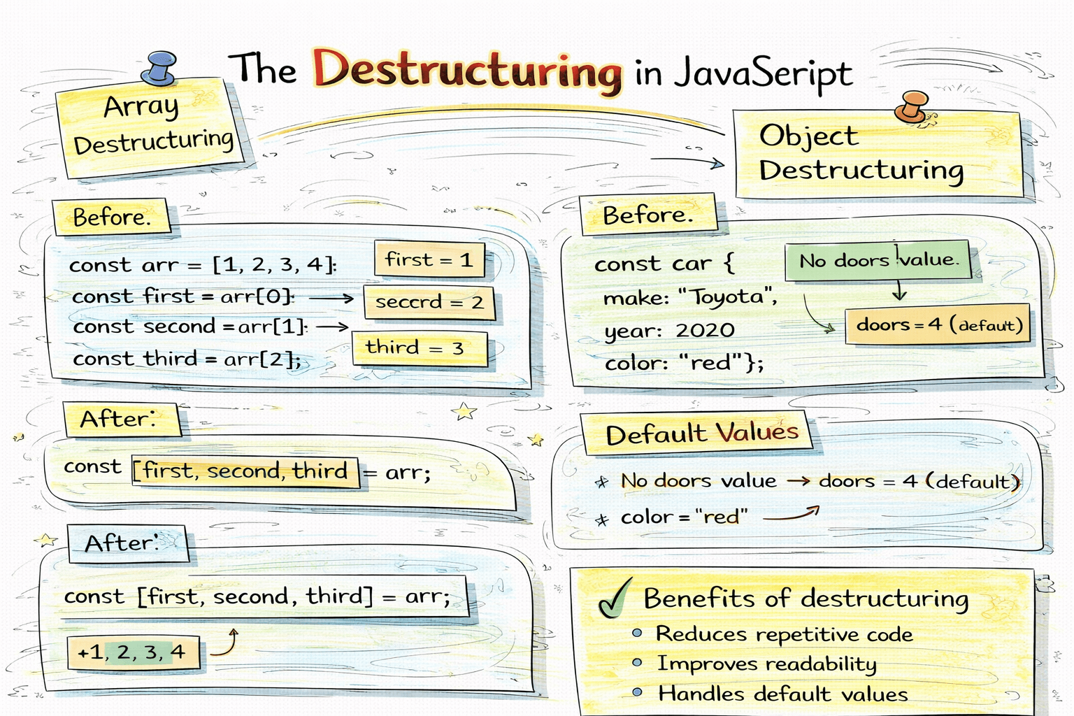 Destructuring is one of the most useful and modern features in JavaScript. It allows you to extract values from arrays and objects and assign them to variables in a clean and readable way. What Destru
