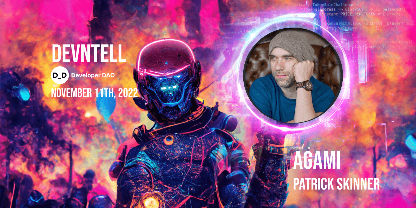 ๐ GM In this weeks episode of DevNTell DAO member Patrick Skinner presents his project, AGAMI ๐ Developer Spotlight Patrick Skinner is a Former Special Operations Combat Medic and Mass Casualty Coordinator that later went into software development....