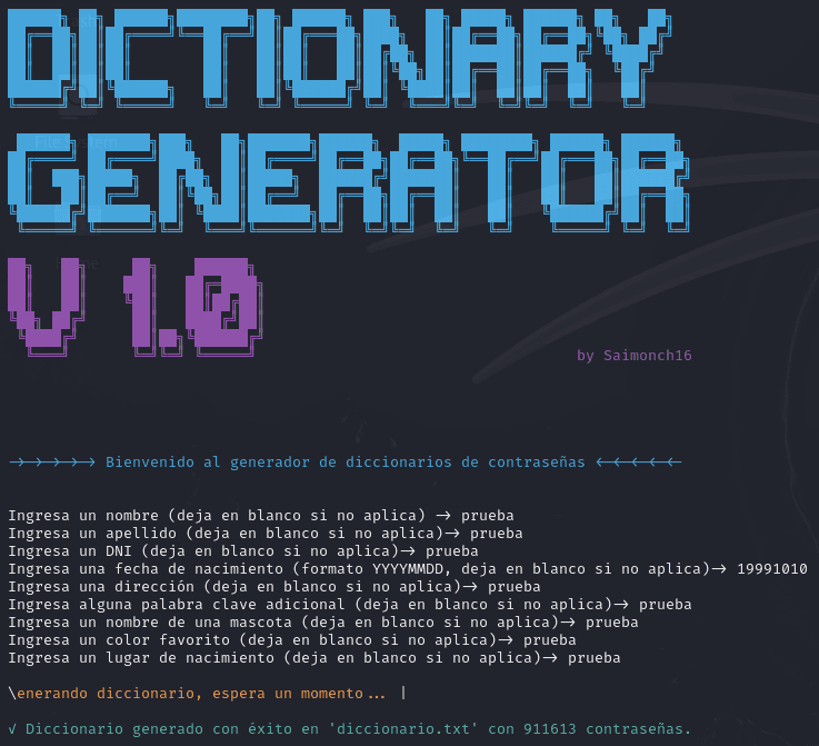 Generador de Diccionarios de Contraseñas Personalizadas Hoy les comparto una herramienta que he creado y publicado en GitHub: un Generador de Diccionarios de Contraseñas. Este script en Python permite crear diccionarios personalizados utilizando info...