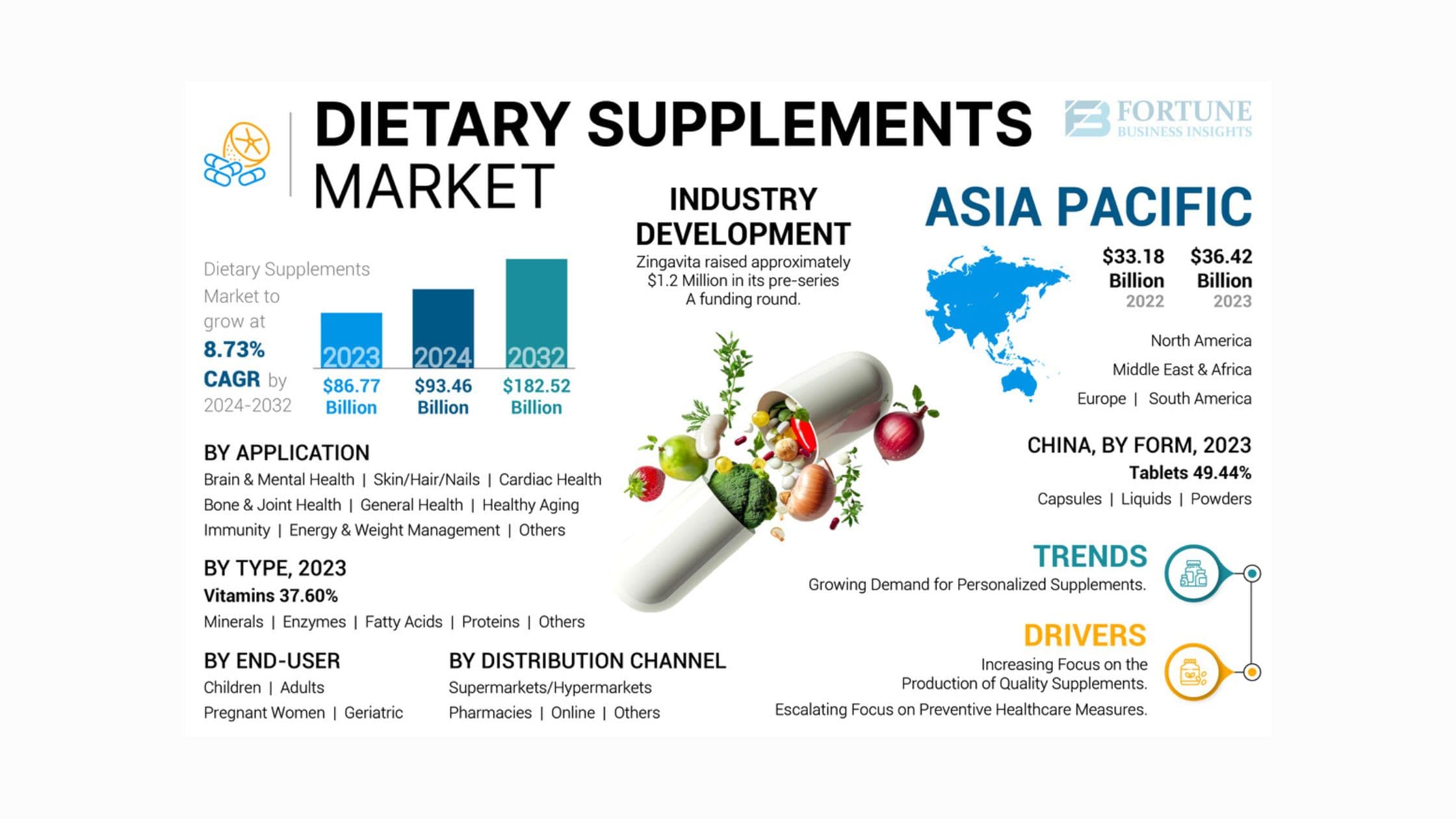 The global dietary supplements market was valued at USD 86.77 billion in 2023 and is forecasted to grow from USD 93.46 billion in 2024 to USD 182.52 billion by 2032, reflecting a CAGR of 8.73% during 2024–2032. In 2023, Asia Pacific accounted for the...
