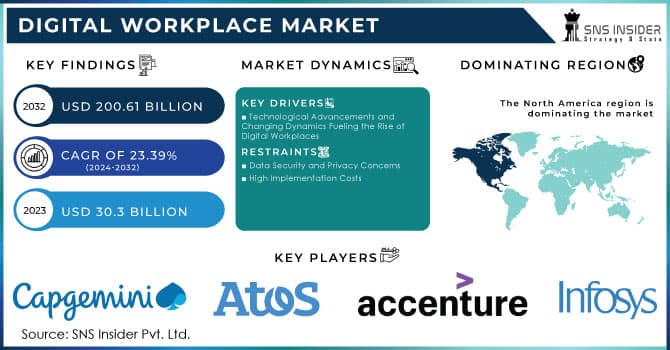 The Digital Workplace Market size was valued at USD 30.3 Billion in 2023 and is expected to grow to USD 200.61 Billion By 2032 and grow at a CAGR of 23.39% over the forecast period of 2024-2032. Digital Workplace Market is witnessing accelerated grow...