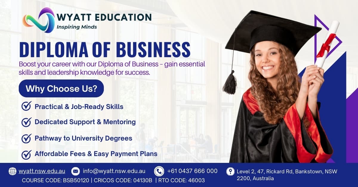 Boost your career with the Wyatt College Diploma of Business (BSB50120). Gain practical business skills, leadership knowledge, and a pathway to university degrees. Affordable fees and dedicated support are available. Enroll now! ๐ Visit Us Online: h...
