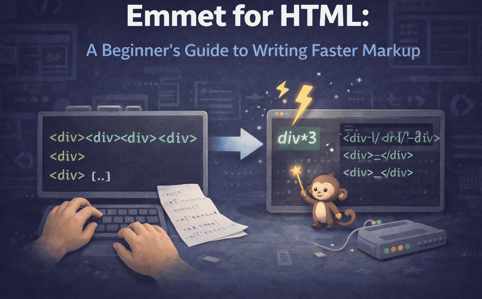 If you are learning HTML, you already know this feeling. You type <div></div> . Then again <div></div> . Then again <div></div> . After 10 minutes, your fingers hurt and your mind is tired. This is where Emmet quietly saves you. What Emmet Is (In Ver...