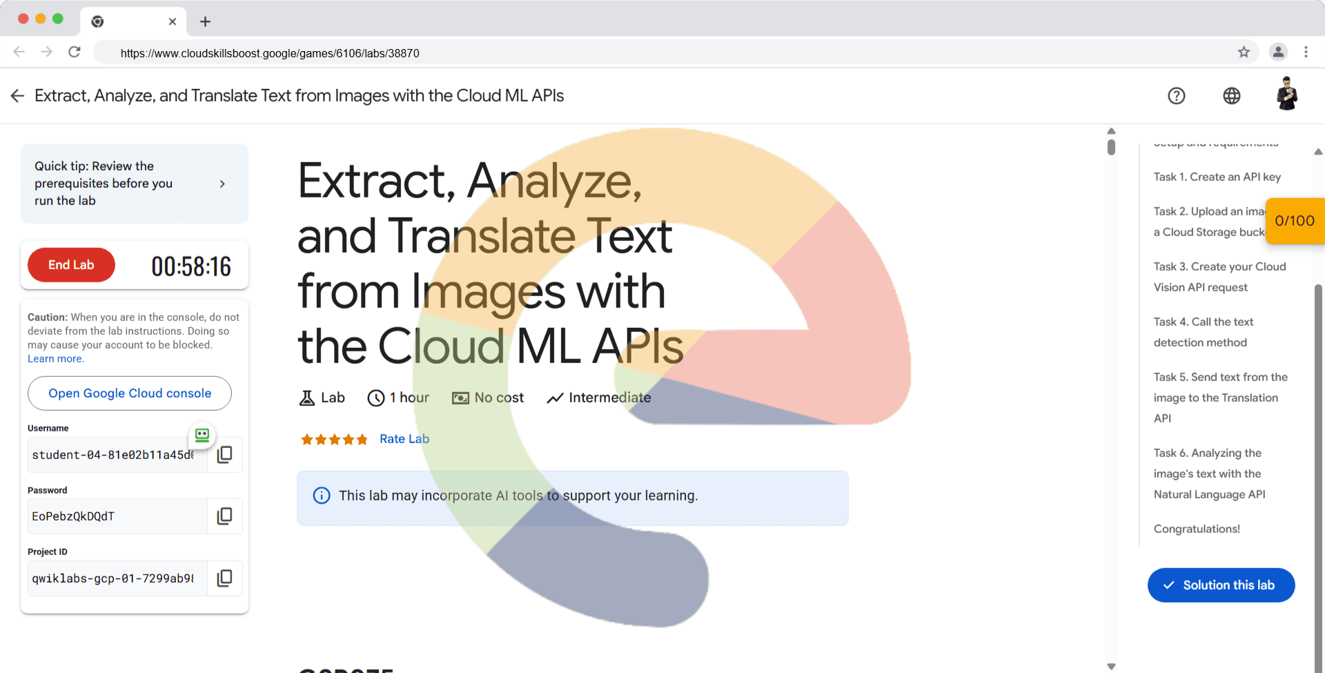 Overview In this lab you'll explore the power of machine learning by using multiple machine learning APIs together. Start with Cloud Vision API's text detection method to make use of Optical Character Recognition (OCR) to extract text from images. Th...