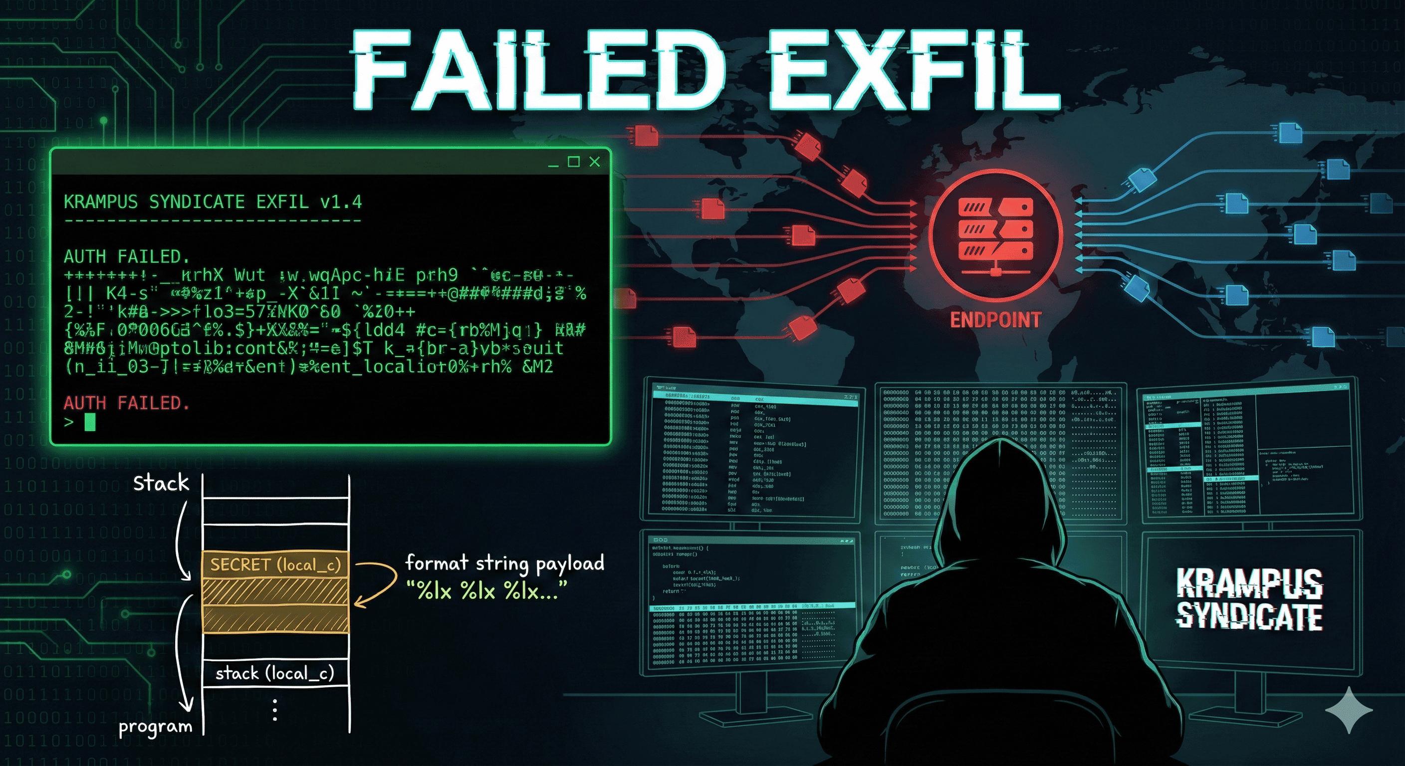 Challenge Description Category: Binary exploitation Author: qvipin The KRAMPUS Syndicate has been using a small remote endpoint they quietly dropped on compromised NPLD machines. When they gain access to a system, they connect to this endpoint and fo...