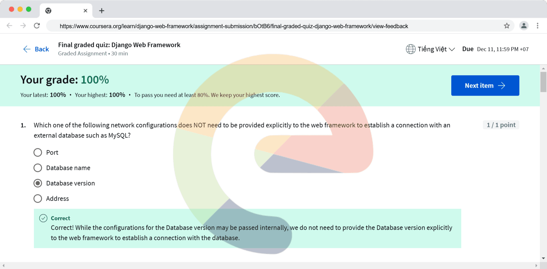 Which one of the following network configurations does NOT need to be provided explicitly to the web framework to establish a connection with an external database such as MySQL? Port Database name Database version Address Which of the followin...