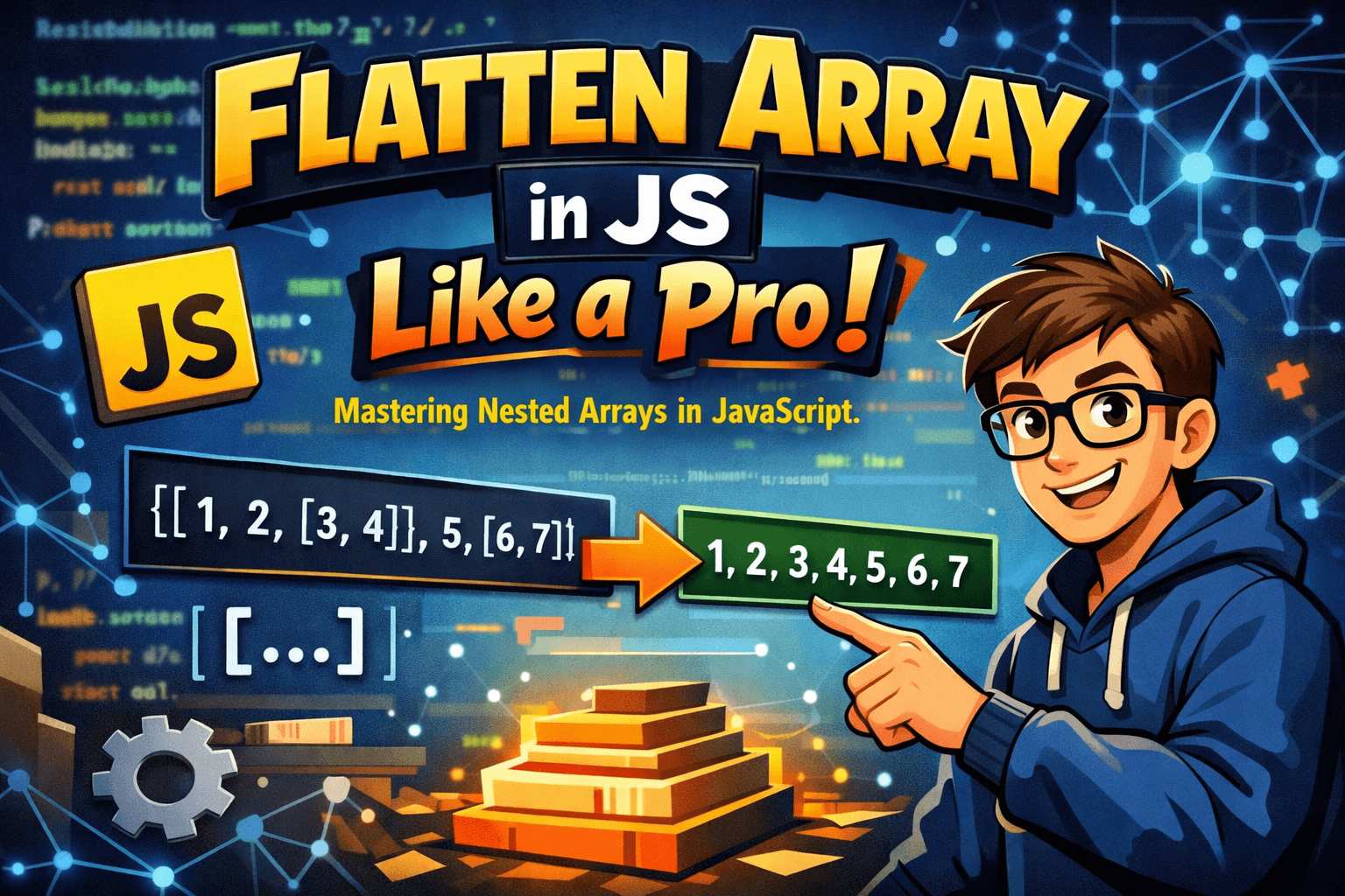 have you ever seen nested arrays ? lets see some What are nested arrays? arrays whose elements can also be arrays and so on . let nestedArrays = [4,5,6,[1,2,[7,8,9],2],8] Did you observe ? how elemen
