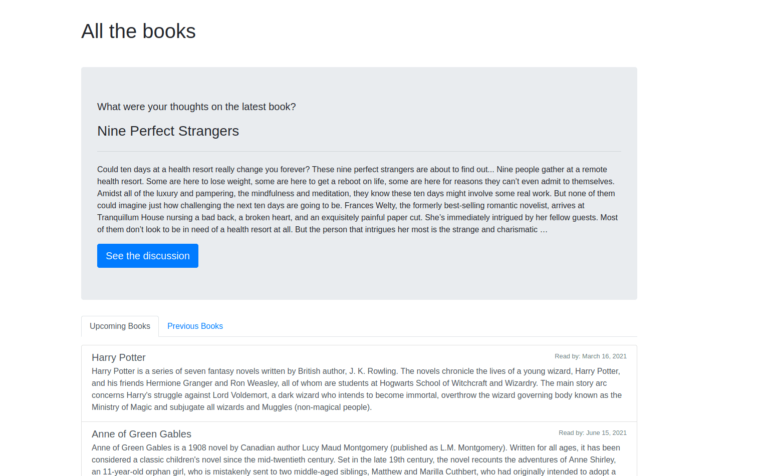 For some reason I'm yet to figure out, my texts stopped showing in the browser when I got to the "using tabs to separate upcoming and previous books" section. All was well when I displayed items gotten from using Books.object.all(). I have copied the exact code from the blog yet no change.