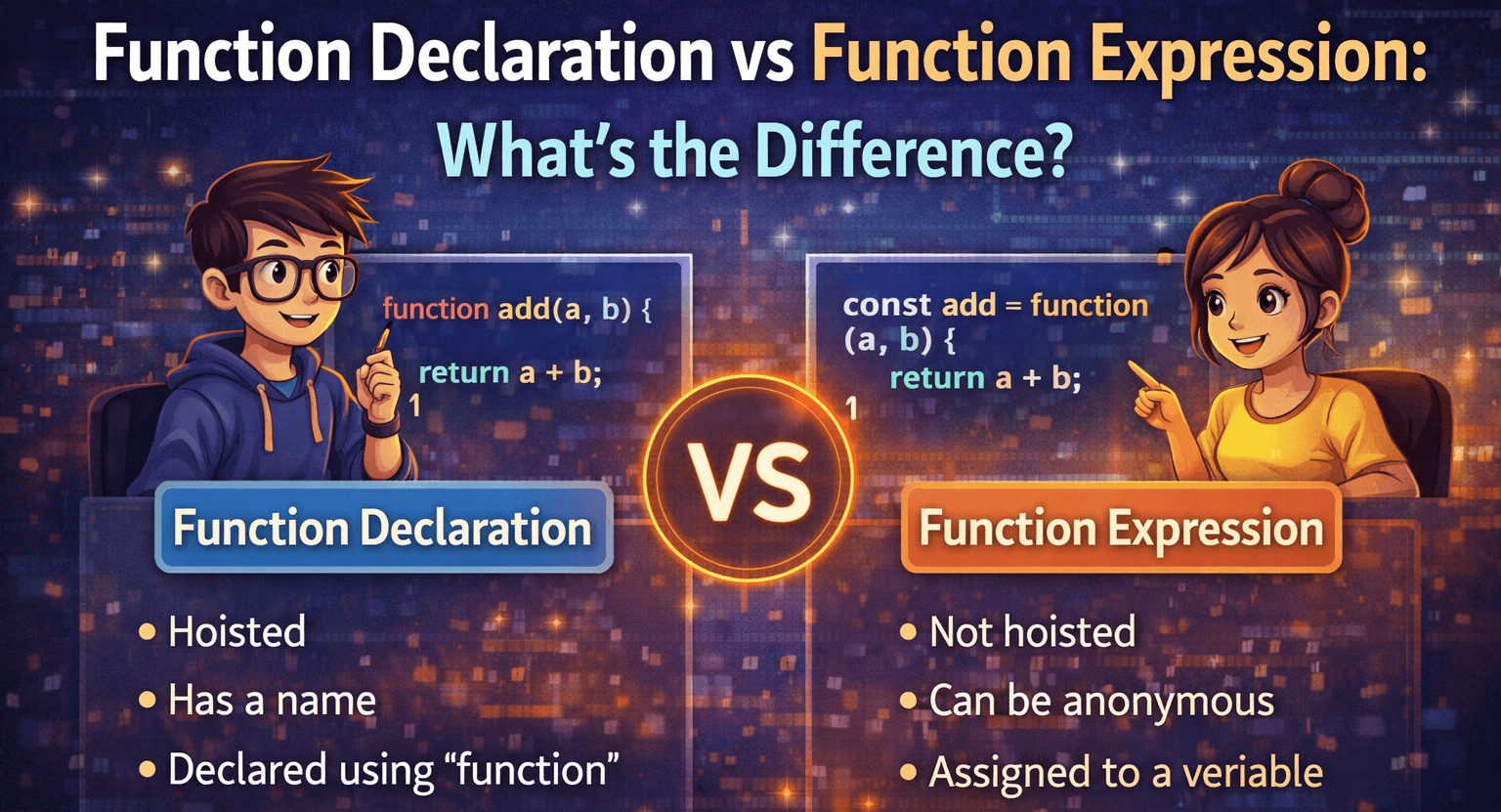 Introduction Functions are reusable blocks of code that perform a task. They let you write a piece of logic once and run it many times. In JavaScript there are two common ways to create functions: fun