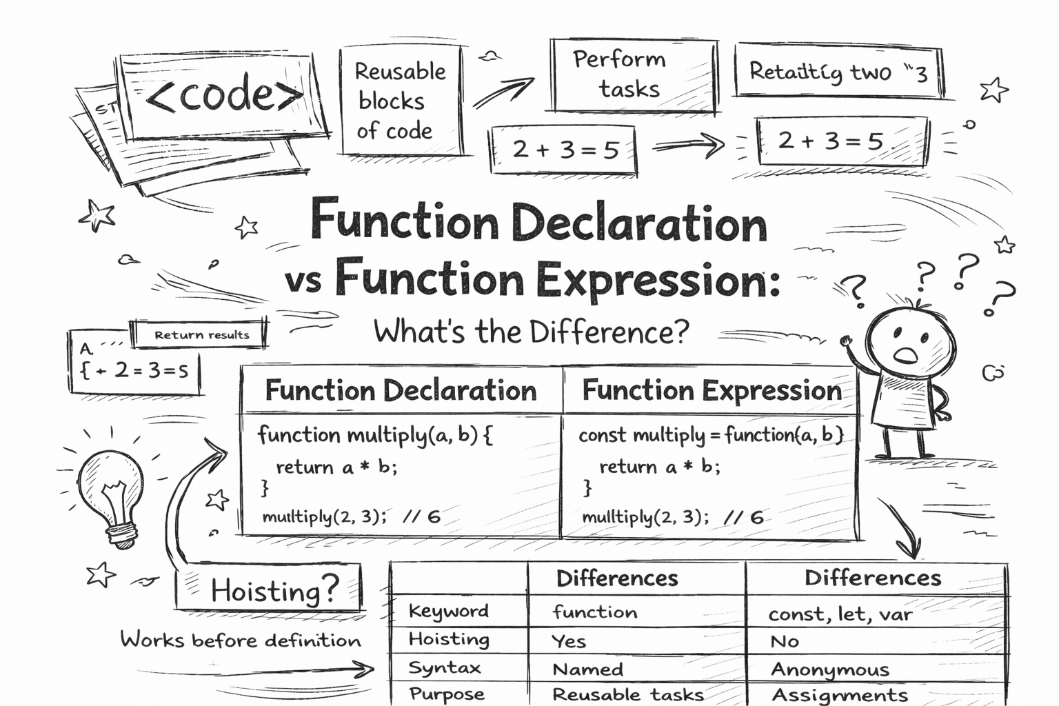 Intro In JavaScript functions are reusable blocks of code. Instead of writing the same logic multiple times, we can place that logic inside a function and use it whenever we need it. Functions can als