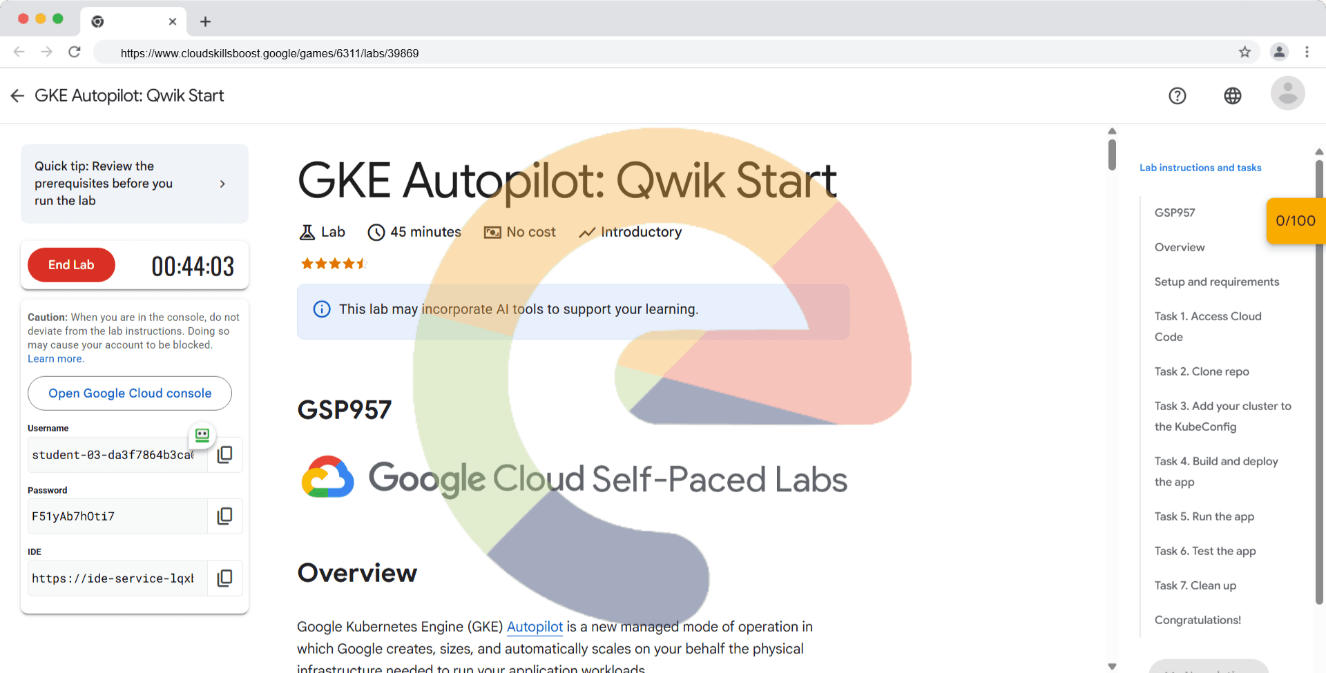 Overview Google Kubernetes Engine (GKE) Autopilot is a new managed mode of operation in which Google creates, sizes, and automatically scales on your behalf the physical infrastructure needed to run your application workloads. In this lab, you get ha...
