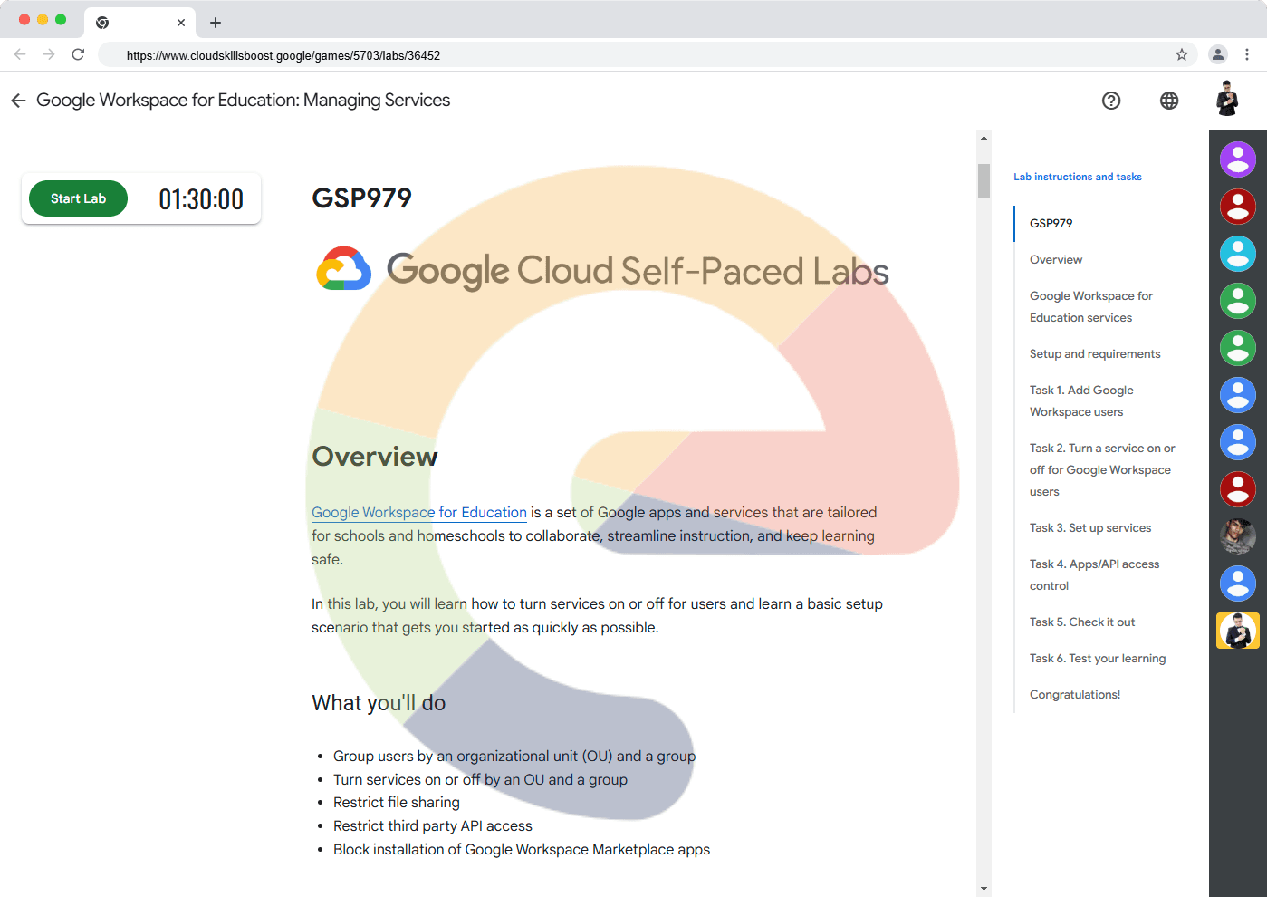 Overview Google Workspace for Education is a set of Google apps and services that are tailored for schools and homeschools to collaborate, streamline instruction, and keep learning safe. In this lab, you will learn how to turn services on or off for ...