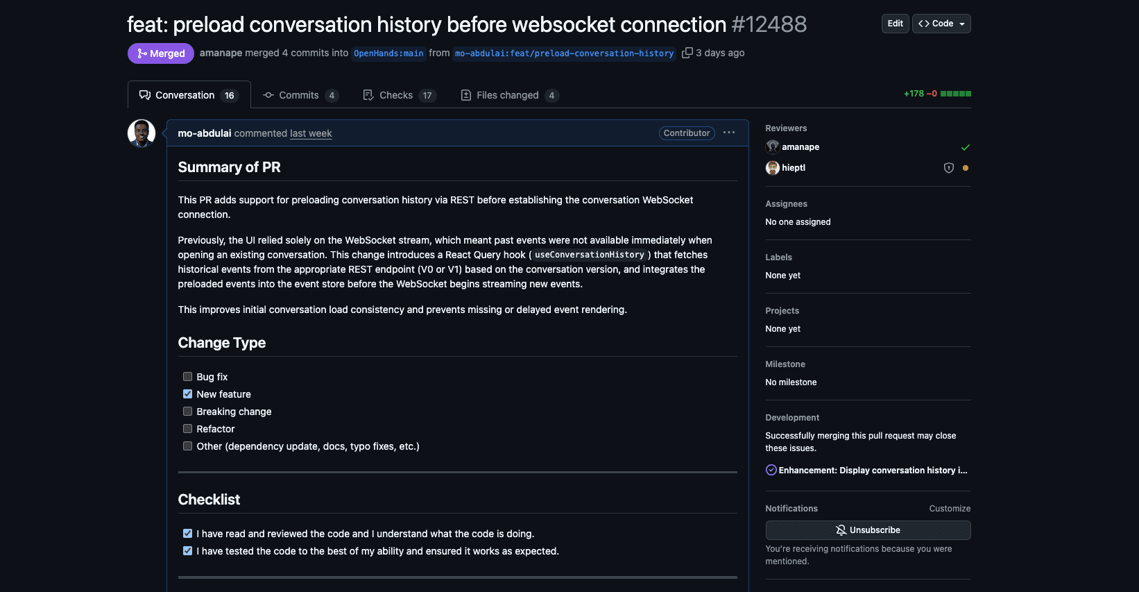 TL;DR I implemented conversation history preloading in the OpenHands frontend. Previously, conversation messages were loaded only through WebSocket streaming, which caused empty or inconsistent history when opening existing chats. I added a REST-base...