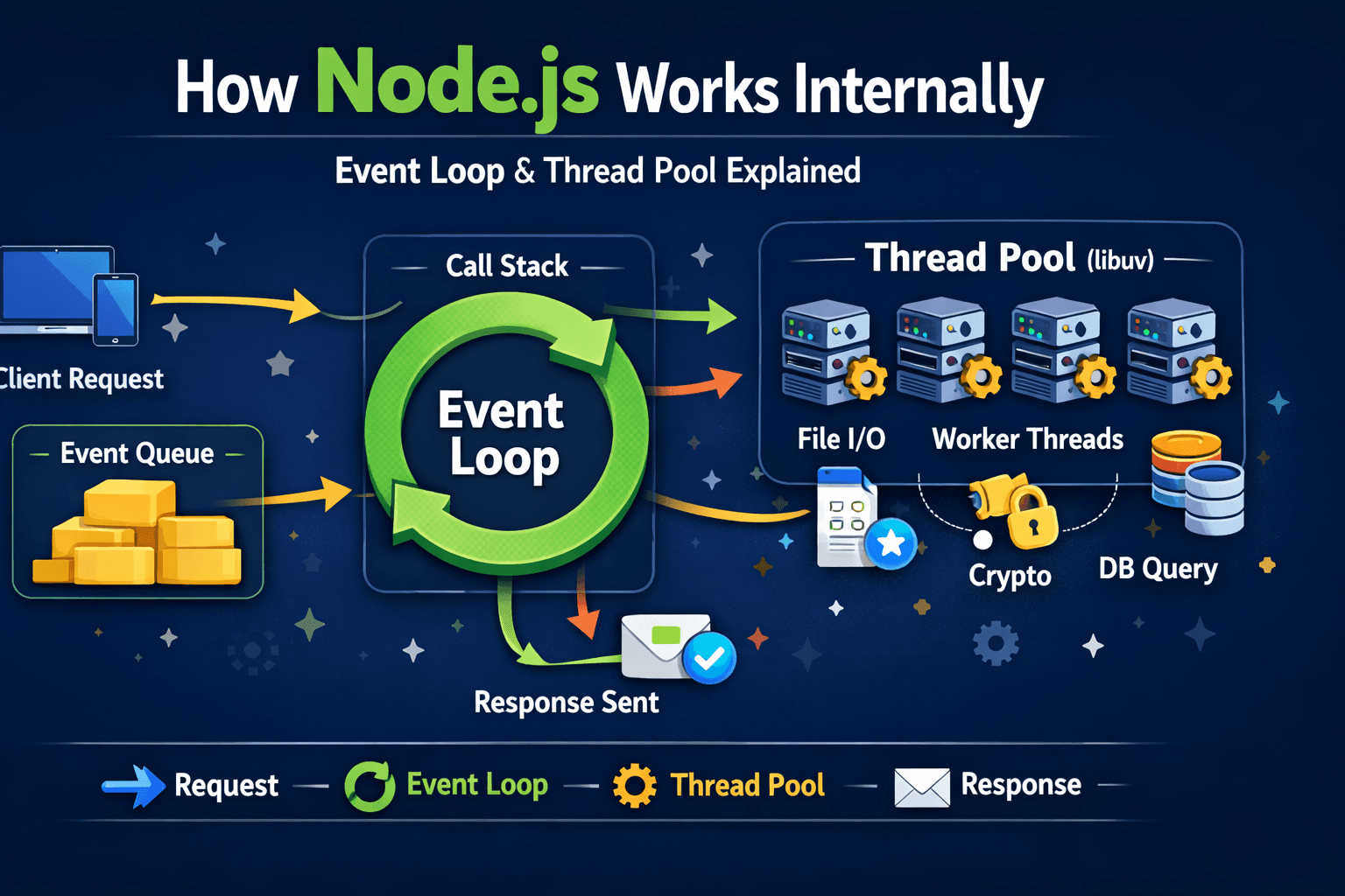 When I first started learning Node.js, I could easily run JavaScript files and create servers. But one question always confused me: “How does Node.js handle thousands of requests at the same time if J