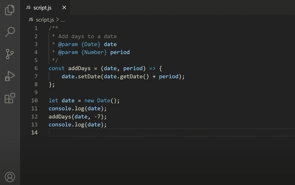 Let’s define a function addDays. The function has two parameters: date to be modified and number of days to add. We use the setDate function to set the new date. And we use the getDate function to get the current date value. So we just add the number...