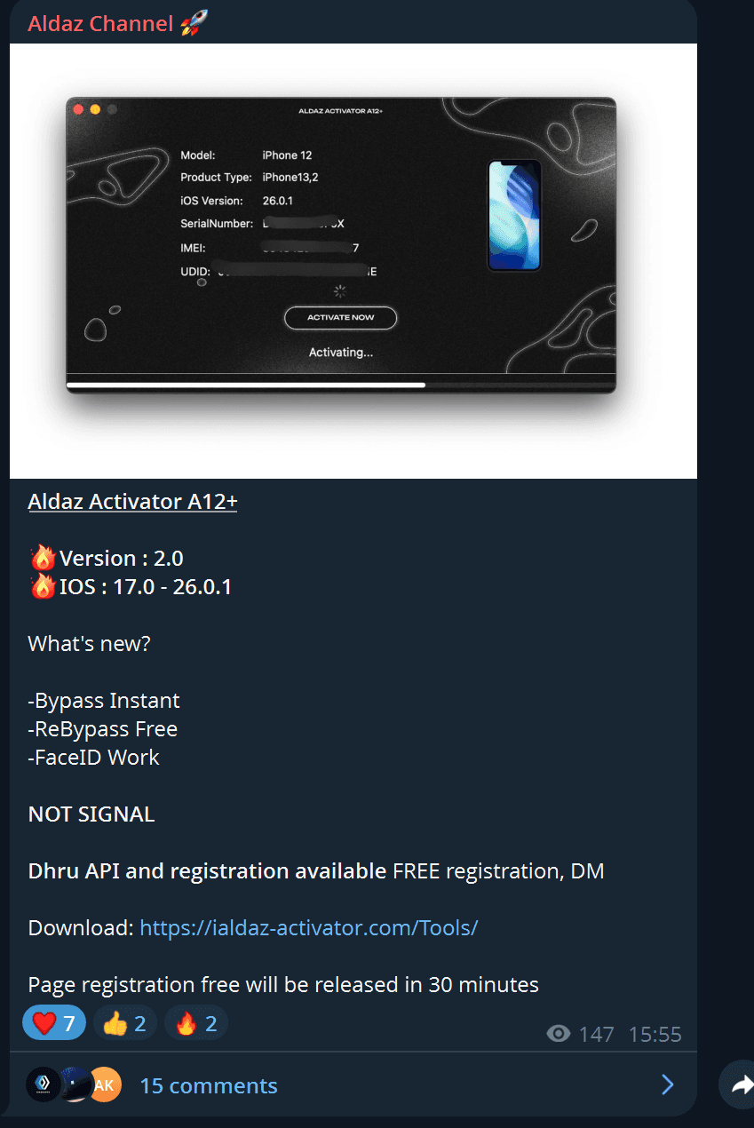 iAldaz’s A12 Activator is here, and for a limited time it’s completely free! Here’s how you can bypass your device today. Requirements Physical access to the device you want to bypass. The device must be on iOS 17.0 - 26.0.1. A stable Wi-Fi connect...