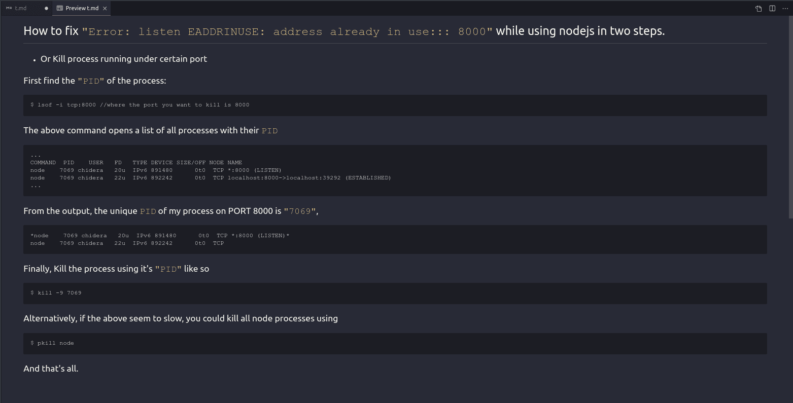 How to fix `"Error: listen EADDRINUSE: address already in use::: 8000"` while using nodejs in two steps.