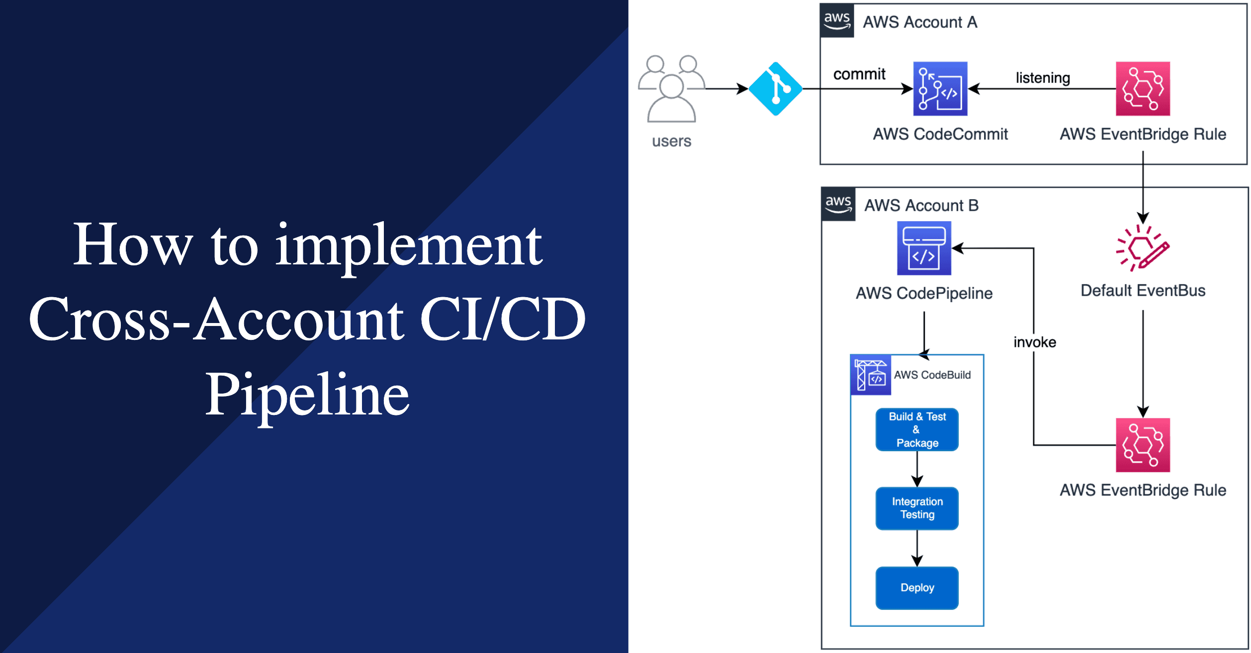 This post is about how to implement cross-account CI/CD worflow. Recently I was dealing with the problem of how to invoke a CodePipeline pipeline when a new commit is pushed to CodeCommit repository in other AWS Account.