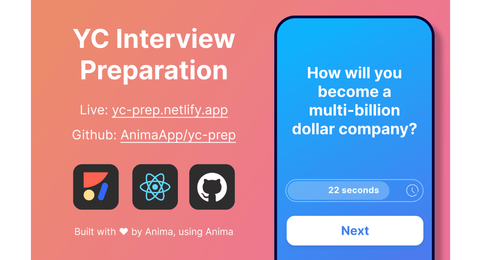 Anima was a part the YC18 cohort and in preparation, developed a prep-questions app for the upcoming interviews. The app provided a training environment, simulating the 10 minute YCombinator interview format, as we geared up for the actual interview ...