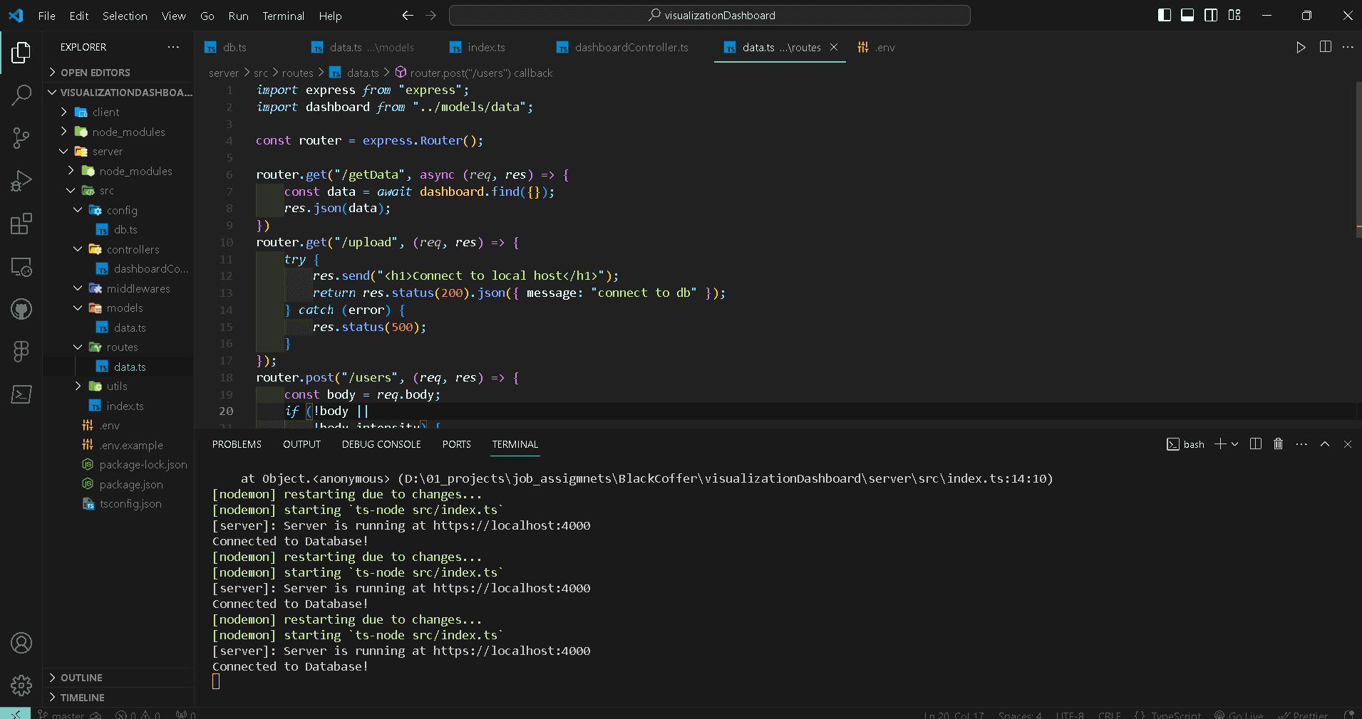 Node and typescript Modules Setup Initial setup of node server in order to install npm packages npm has to be initailized. cd server npm init -y installing necessary database, express backend dotenv cors dependencies in normal mode. npm i express no...
